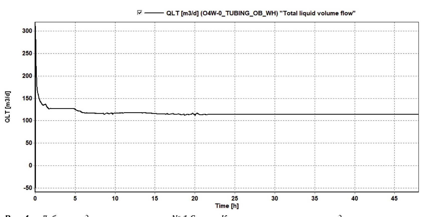 Работа скважины смоделирована в программном комплексе OLGA. Согласно результатам моделирования, дебит жидкости стабилизируется на уровне 115 м3/сут. (рис. 4). Текущий дебит скважины № 1 Северо-Комсомольского месторождения составляет 116 м3/сут. Таким образом, можно считать, что созданная модель достоверно отражает режим работы скважины.