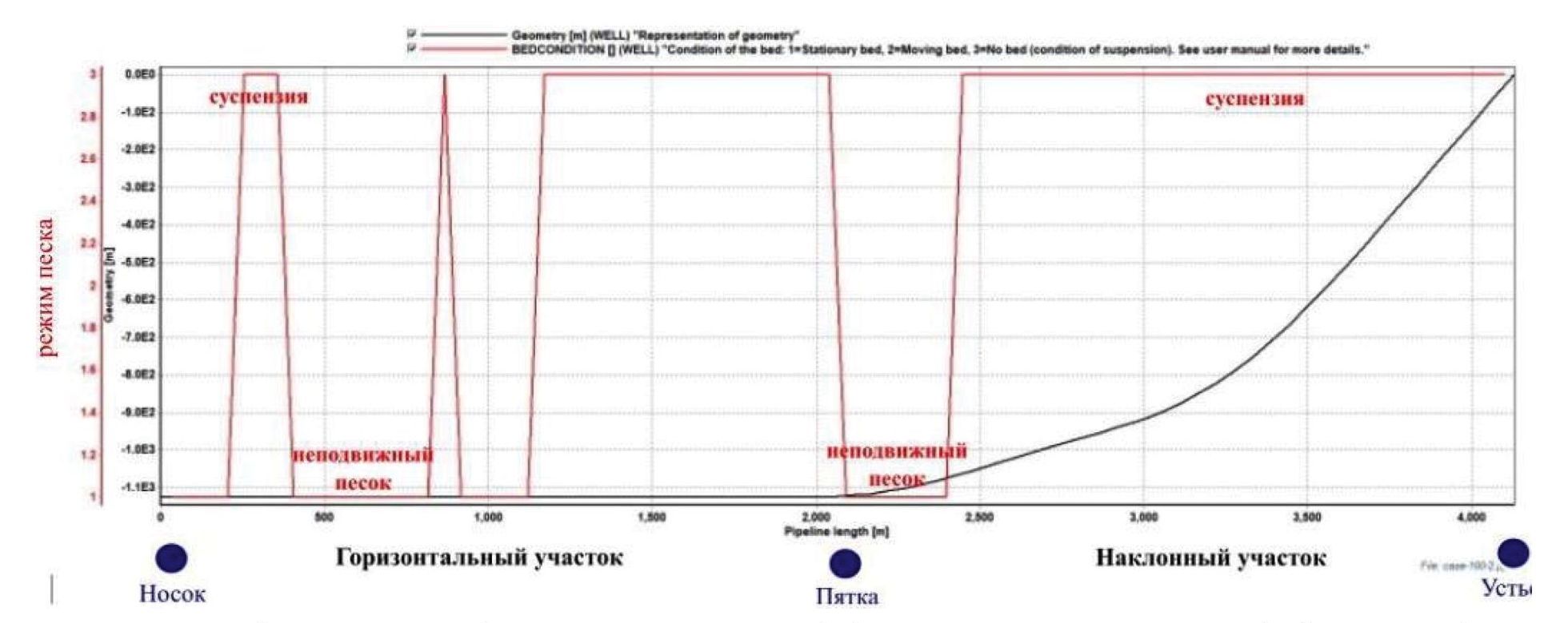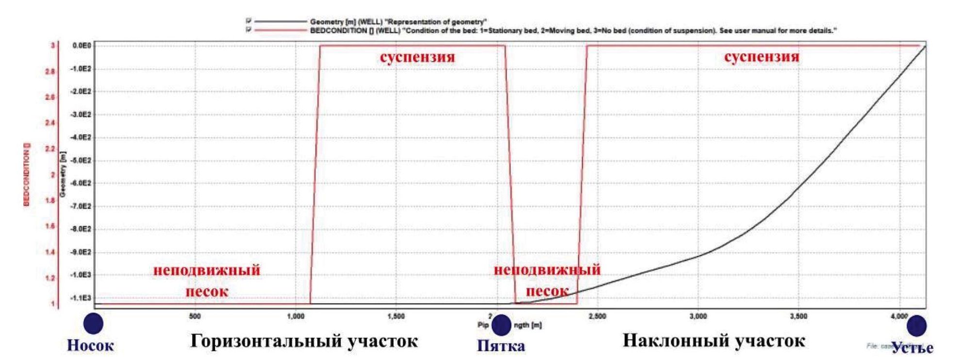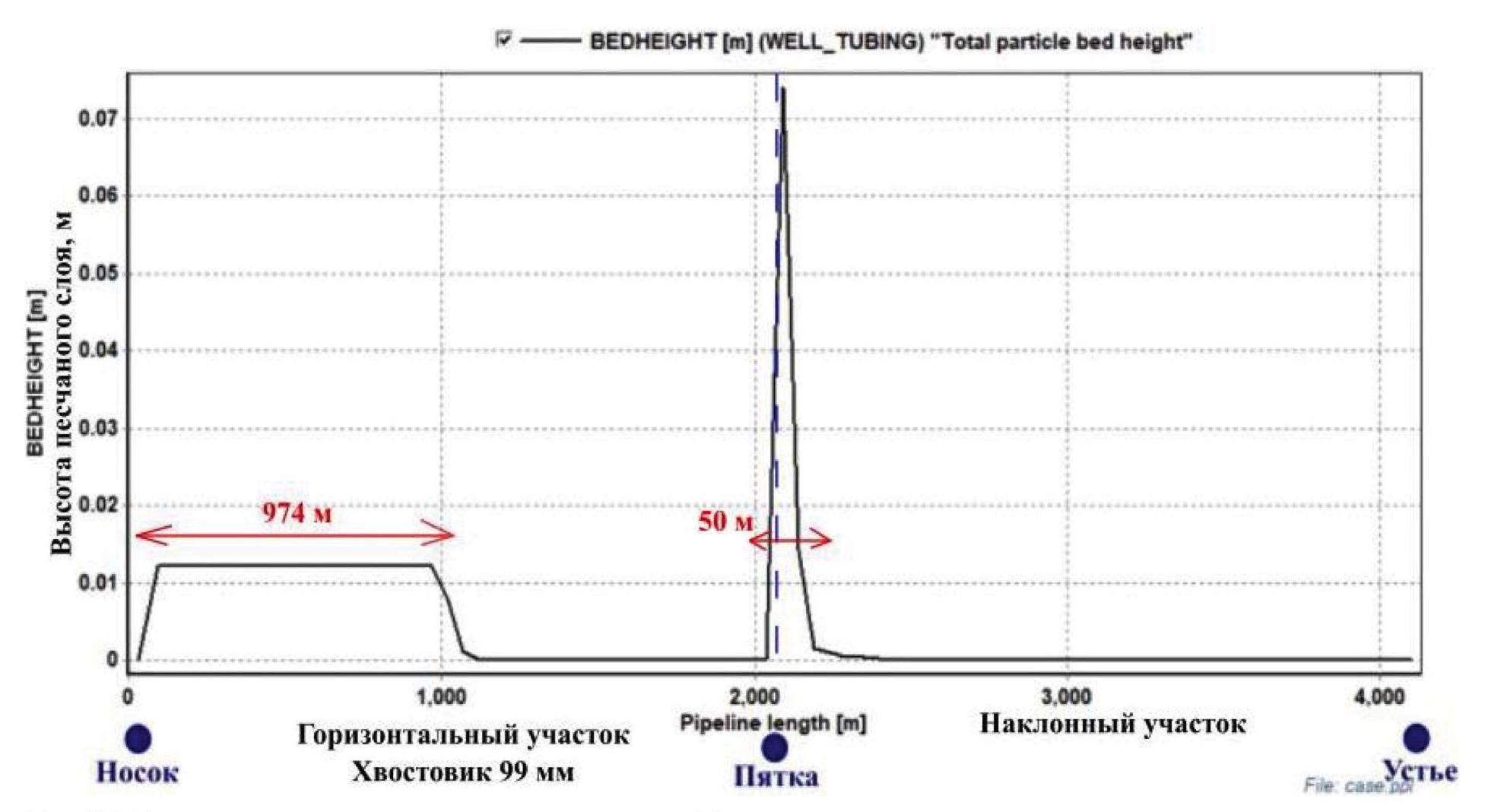 Высота песчаной пробки в эксплуатационной колонне составит ~50 м. В горизонтальном стволе длина участка, где накапливается песок, составит ~974 м (51 % длины продуктивного интервала).