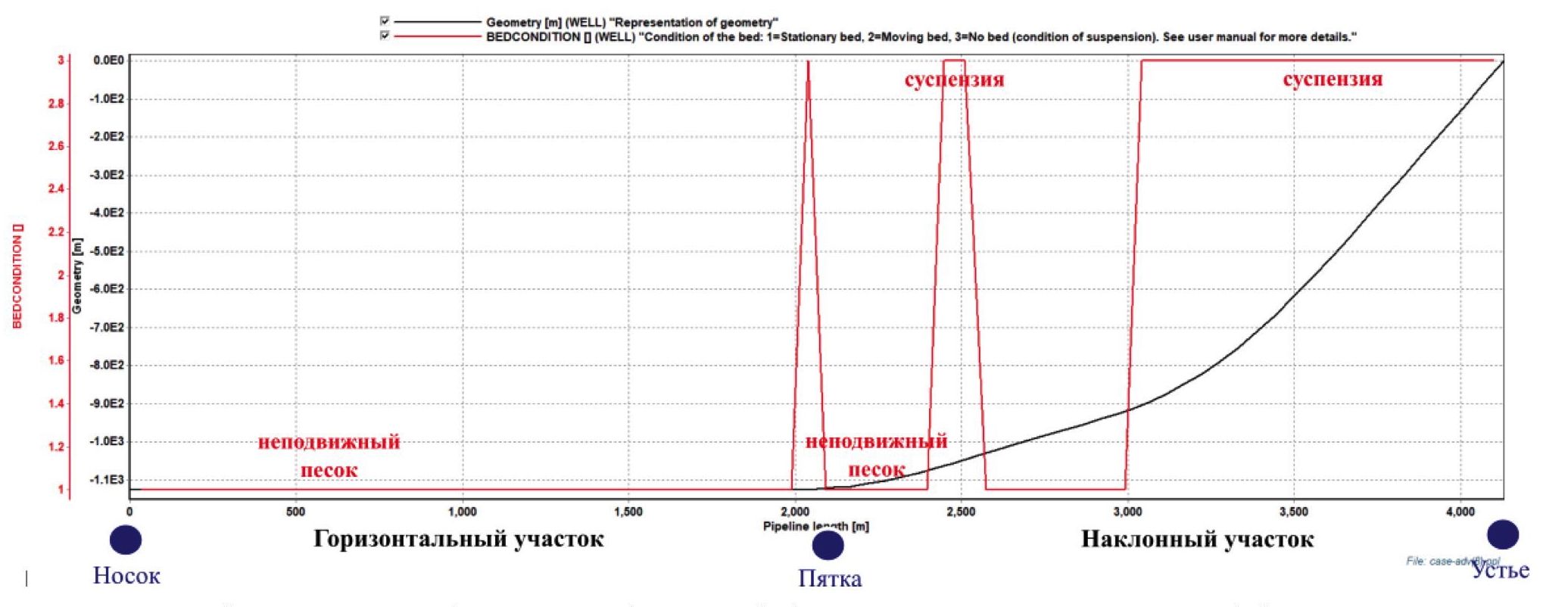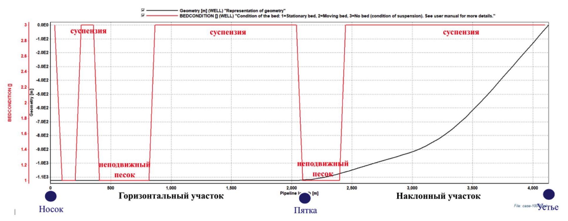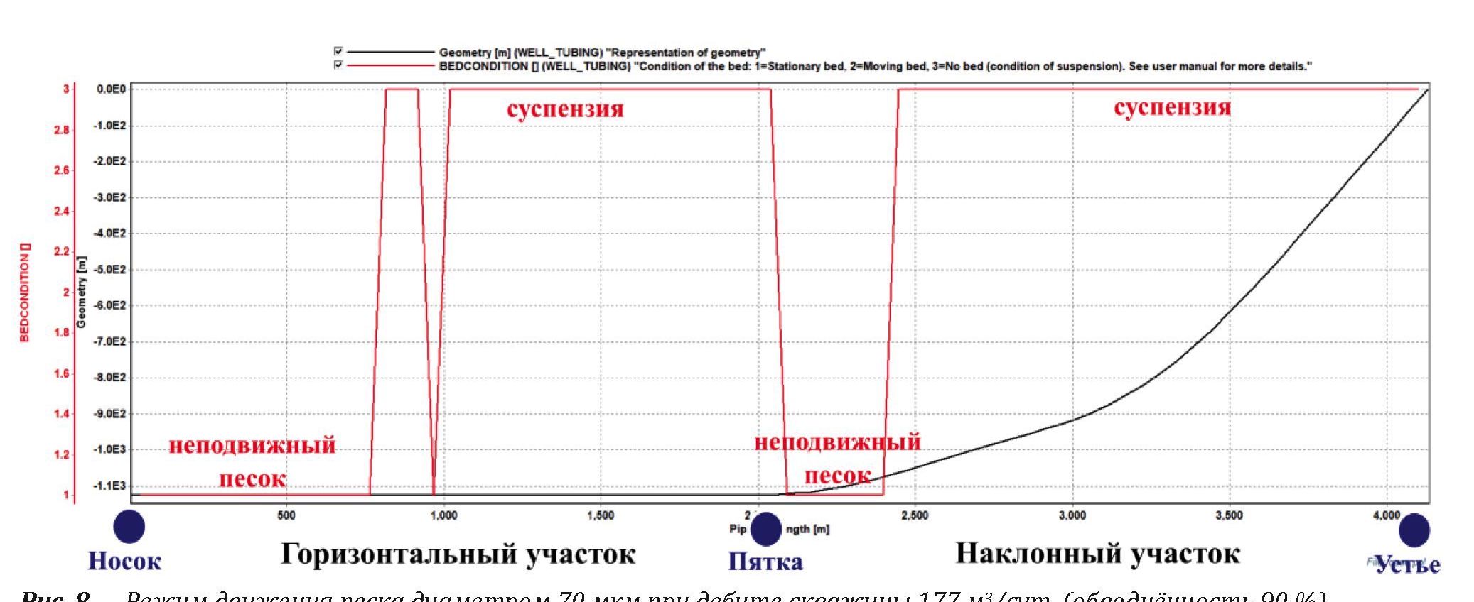 Высота песчаной пробки в эксплуатационной колонне составит ~50 м. В горизонтальном стволе длина участка, где накапливается песок, составит ~974 м (51 % длины продуктивного интервала).