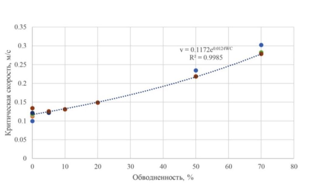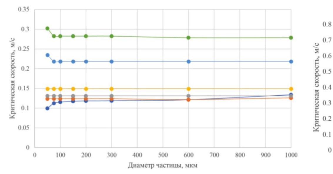 - Критическая скорость для смеси «нефть–вода» мало зависит от размера частиц. Однако для смеси «нефть–газ» увеличение диаметра частиц приводит к росту скорости.