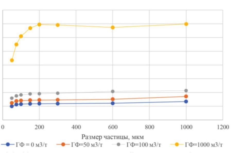 При проведении лабораторных исследований замечено, что размер частиц, проходящих через фильтр, зависит не только от размера зазора на фильтре, но и от состава фильтруемого флюида. Проведены тесты для смесей в различных соотношениях (нефть/вода и нефть/газ), и определён размер зёрен D90 (90 % частиц, проходящих через фильтр, будут иметь меньший диаметр). Результаты лабораторных исследований приведены в табл. 5.