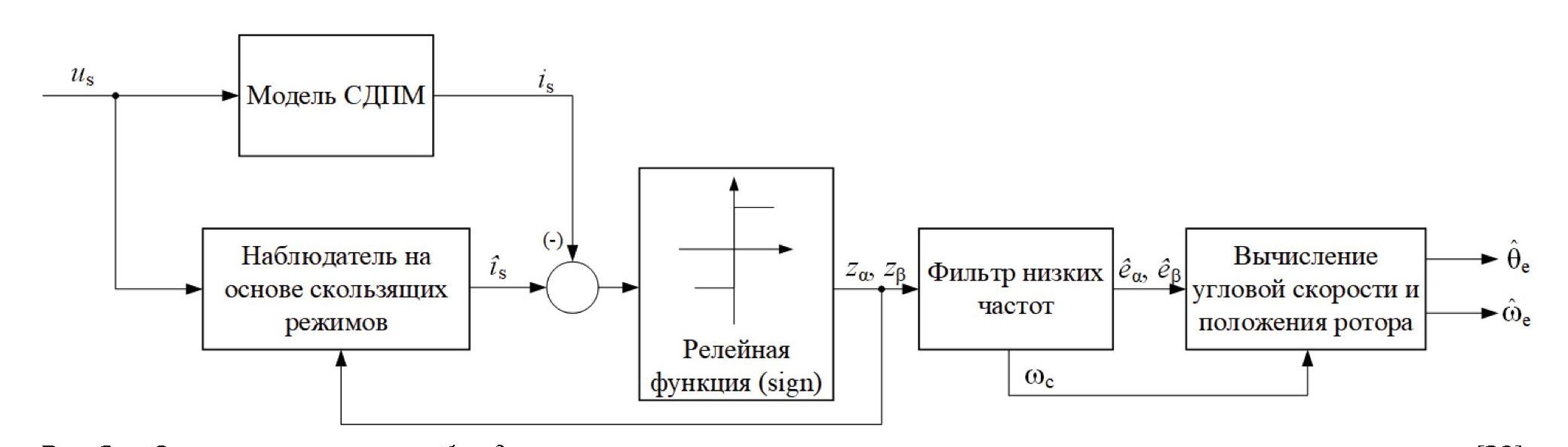 При построении систем управления СДПМ наблюдатели на основе скользящих режимов, как правило, представляют собой наблюдатели потокосцепления постоянного магнита ротора (или противо-ЭДС двигателя) для получения оценки скорости вращения ротора [36–39]. К достоинствам наблюдателей на основе скользящего режима можно отнести простую структуру, высокую робастность и хорошие динамические свойства. Основной недостаток наблюдателей на основе скользящих режимов – существенные пульсации и искажение гармонического состава оцениваемых величин, поэтому в схемах классических скользящих наблюдателей (рис. 2) предусмотрен фильтр низких частот. Тем не менее использование пассивных фильтров приводит к фазовой задержке и ослаблению амплитуды сигналов, что негативно сказывается на динамических характеристиках наблюдателя.