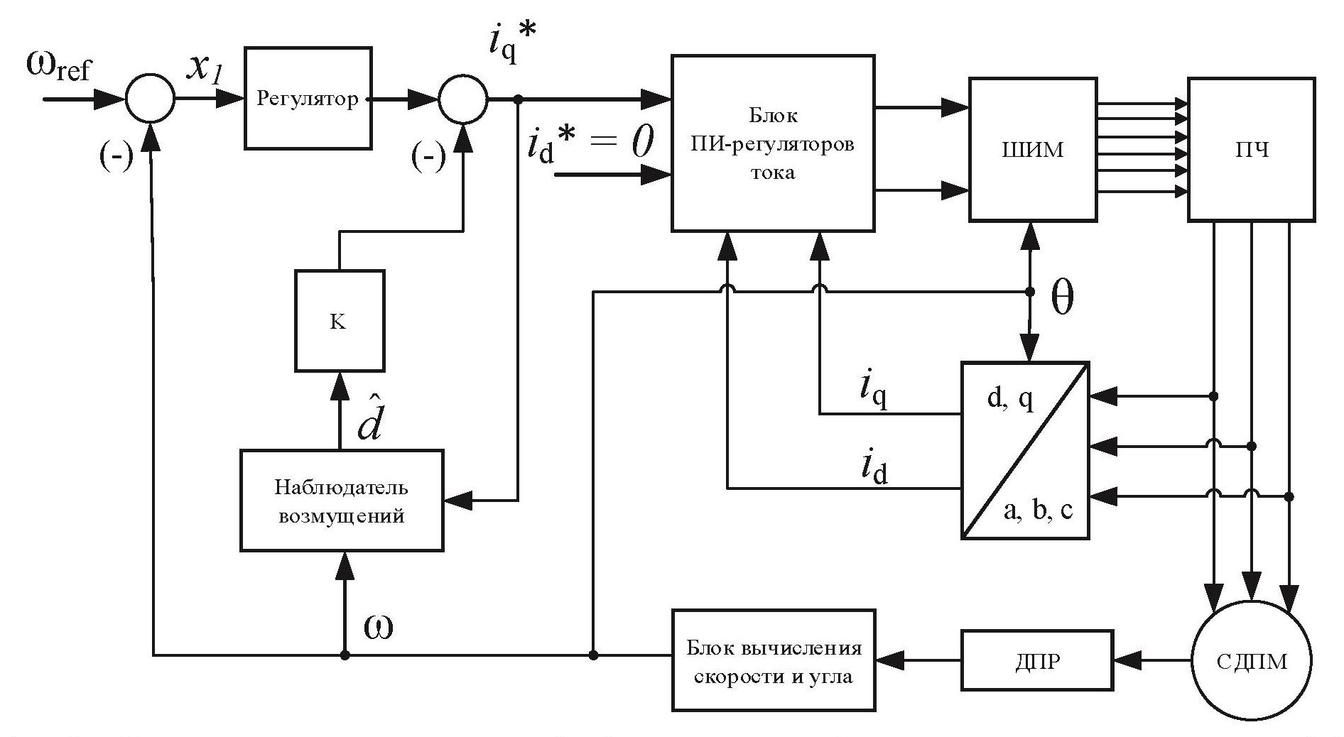 Fig. 3. One of disturbance observer options in PMSM control system [50] (ШИМ – pulse width modulation block; ПЧ - frequency converter; ДПР - rotor position sensor)