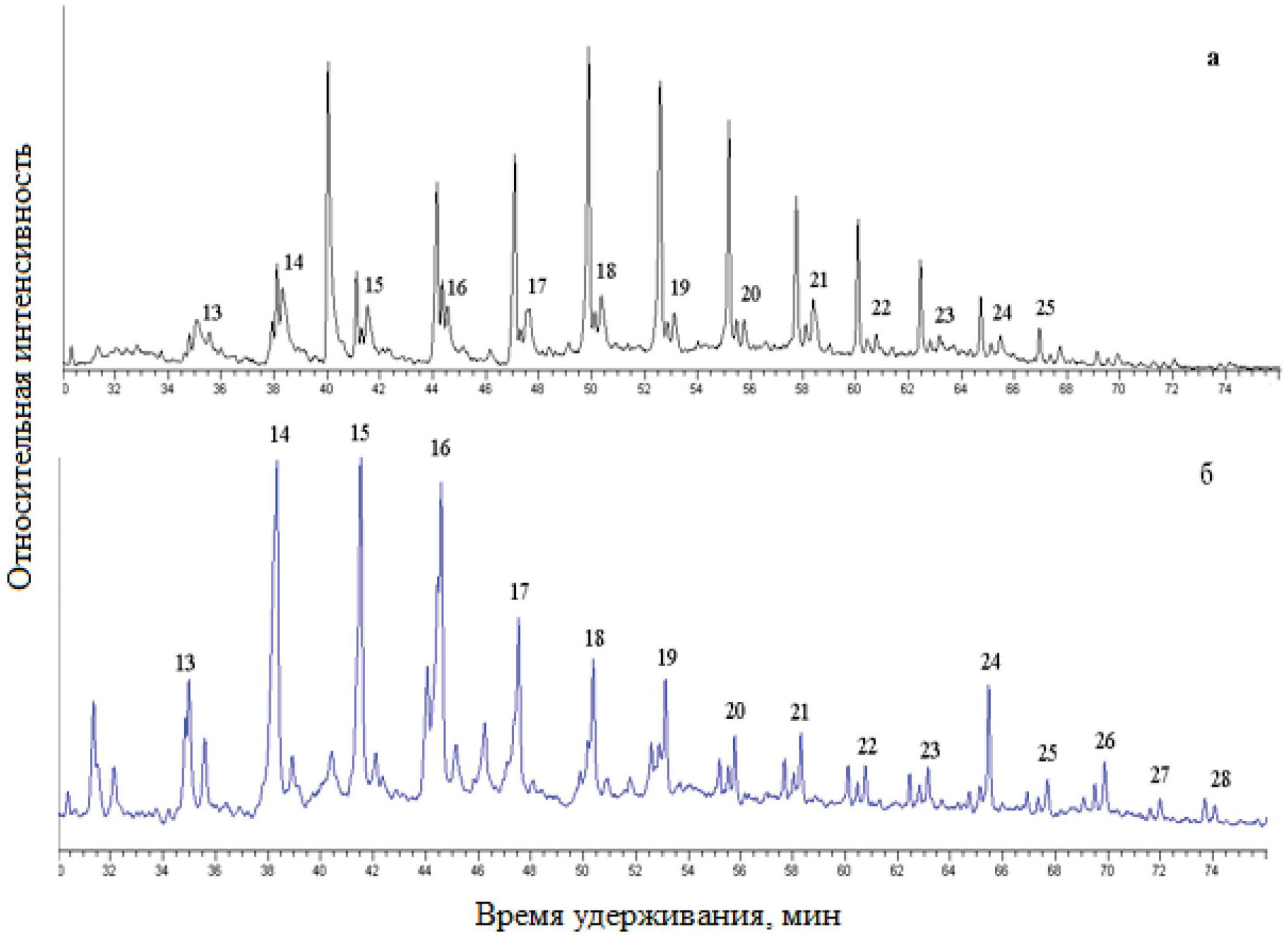 Fig. 3. GC-MS chromatograms of at m/z of 98 products of RICO of high molecular weight asphaltenes of bituminous oils I (a) and II (б)