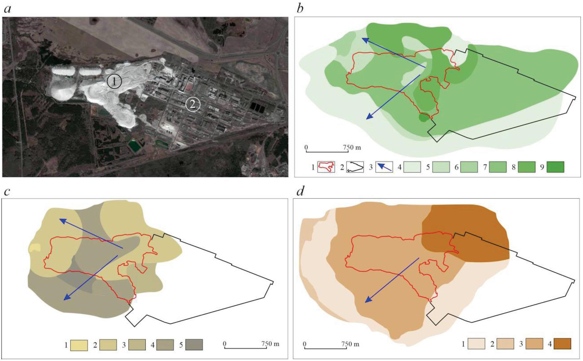Рис. 1. Водопроводимость: a) спутниковый снимок: 1 – отвалы фосфогипса; 2 – промышленная площадка; b) грунтовый водоносный горизонт: 1 – отвалы фосфогипса; 2 – промышленная площадка; 3 – направление потока грунтовых вод; водопроводимость (м2/сут): 4 – 0,1; 5 – 0,5; 6 – 1,0; 7 – 2,0; 8 – 4,3; 9 – 5,0; c) подморенный водоносный горизонт, водопроводимость (м2/сут): 1 – 5,0; 2 – 30–50; 3 – 60–80; 4 – 100–130; 5 – 150; d) палеогеновый водоносный горизонт, водопроводимость (м2/сут): 1 – 100; 2 – 130; 3 – 200; 4 – 230