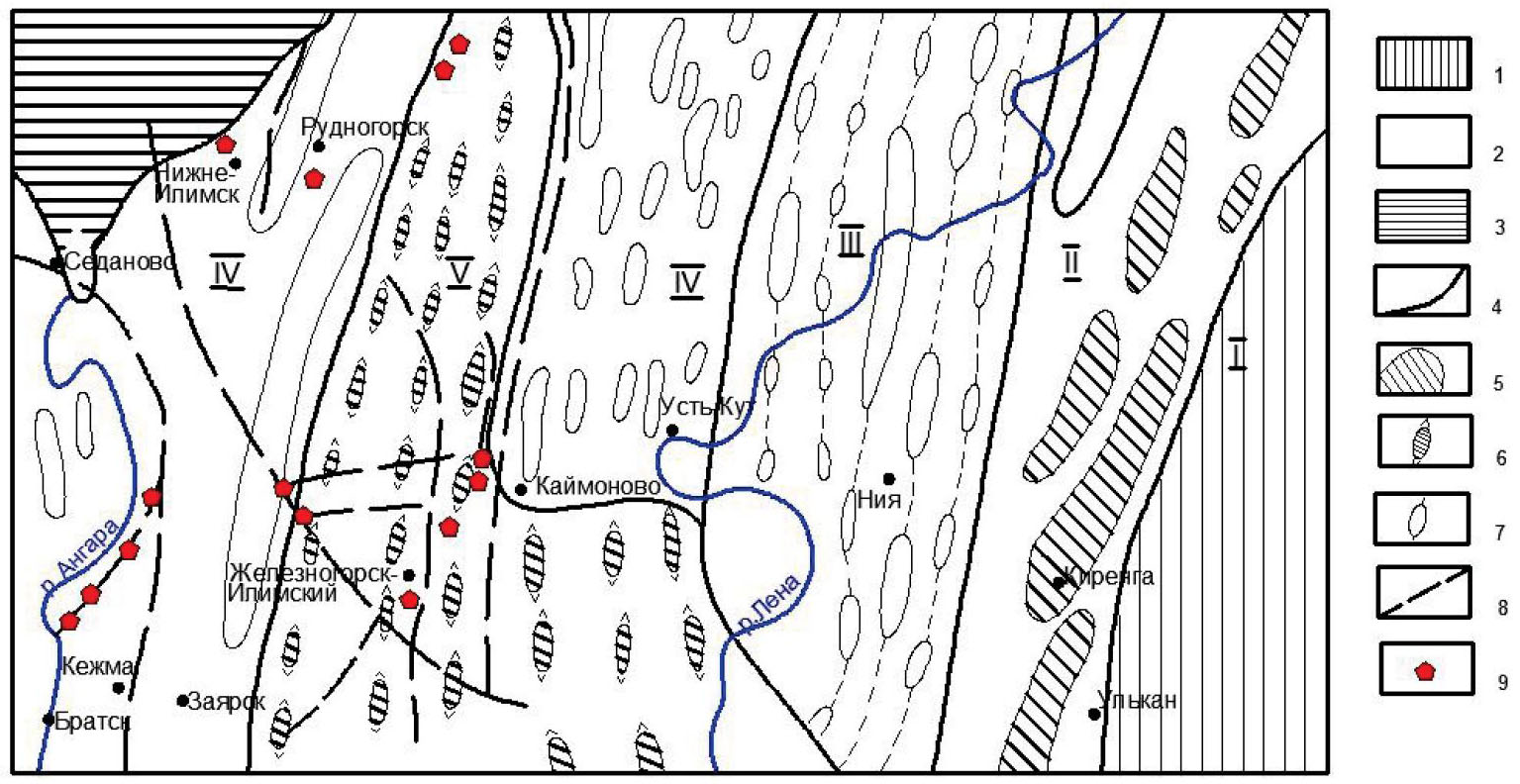 Fig. 1. Diagram of structural-tectonic zoning of the central part of the Angara-Lena foredeep (map scale 1:3000000) [3]: Geological structures of the first order: 1 – Baikal folded region; 2 – Angara-Lena foredeep; 3 – Tunguska syneclise. Geological structures of the second order: 4 – boundaries of the fourth order structures; I – Baikal syncline, II – Lena-Kirenka anticline, III – Markovsko-Icherskaya zone of brachiform folds, IV – Nepa arched uplift, V – Ilim-Lena zone of brachiform structures. Geological structures of the third order: 5 – linear anticlinal folds; 6 – brachyform anticlinal folds; 7 – isolated anticlinal folds; 8 – trap-injected faults; 9 – diatremes