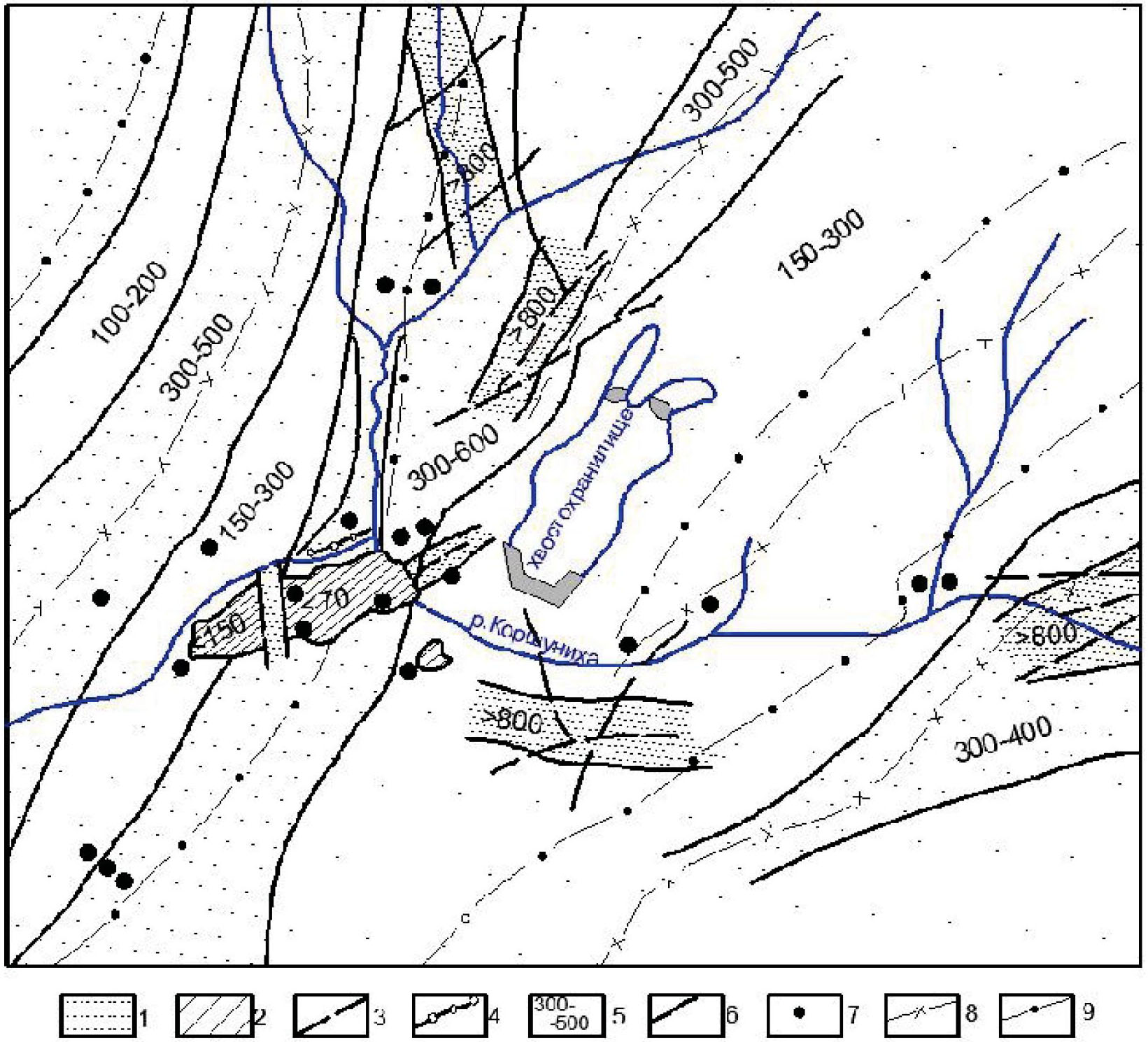 Fig. 2. Structural-hydrogeological diagram of the Korshunovskoe iron ore deposit area (map scale 1:150000) [3]: 1 – hydrogeological basins, speckle intensity characterizes water permeability degree of rocks (maximum degree in near-axial parts and minimum on structure flanks); 2 – ring hydrogeological massifs; 3, 4 – fault zones: 3 – flooded, 4 – screening; 5 – permeability coefficients, m2/day; 6 – boundaries of variable permeability zones; 7 – reference observation points (hydrogeological wells); 8, 9 – axes of brachiform structures: 8 – anticlinal, 9 – synclinal