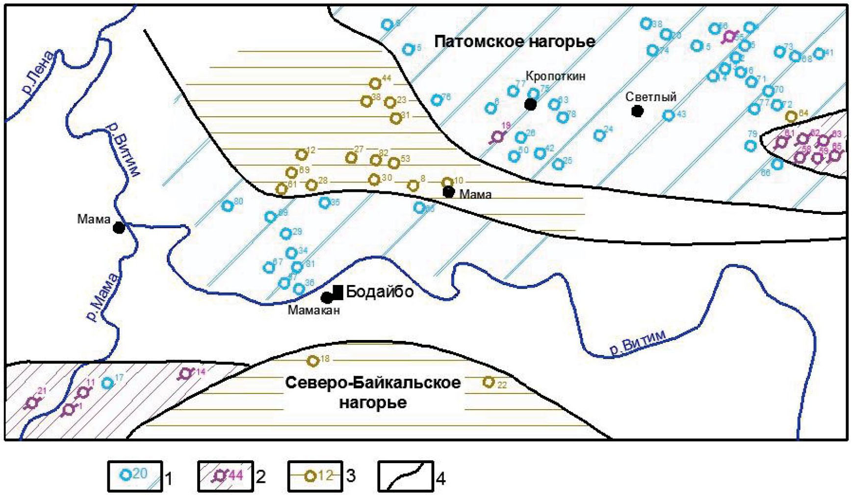 Fig. 3. Zoning diagram of Lena gold ore region fields according to the complexity of engineering and hydrogeological conditions [3] (map scale: 1:2000000): 1 – first group complexity deposits; 2 – second group complexity deposits; 3 – third group complexity deposits (figure – model number of the object: 1. Small Patom (top, 2. Small Patom (bottom), 3. Bolshoy Ballagnach, 4. Vsilevsky, 5. Pavlovsky, 7. Nirokam, 8. Kamustyag, 9. Bolshoy Illigir, 10. Bolshoy Makalak, 11. Tessa, 12. Leo Nakatami, 13. Bolshaya Bizhuihta, 14. Dodykhta (Mamakan), 15. Kevakta, Bolshaya Bezymyanka, 16. Kreshchensky, 17. Kaverga, 18. Ikibzyak (bottom), 19. Ugakhan (bottom), 20. Bolshaya Taimendra, 21. Monokan, 22. Chayangro, 23. Marakan, 24. Kadalikan, 25. Vacha (middle reaches), 26. Bolshaya Bezymyanka (Nygra), 27. Bolshoy Dogaldyn, 28. Akamak-Nakatami, 29. Kamensky (dredging range), 30. Takhtykan-Berikan, 31. Veselyaevsky, 32. Bolshoy Patom (dredging range), 83. Gorbylyakh (bottom), 85. Gorbylyakh (top)); 4 – conditional boundaries between the areas with different complexity of engineering and hydrogeological conditions