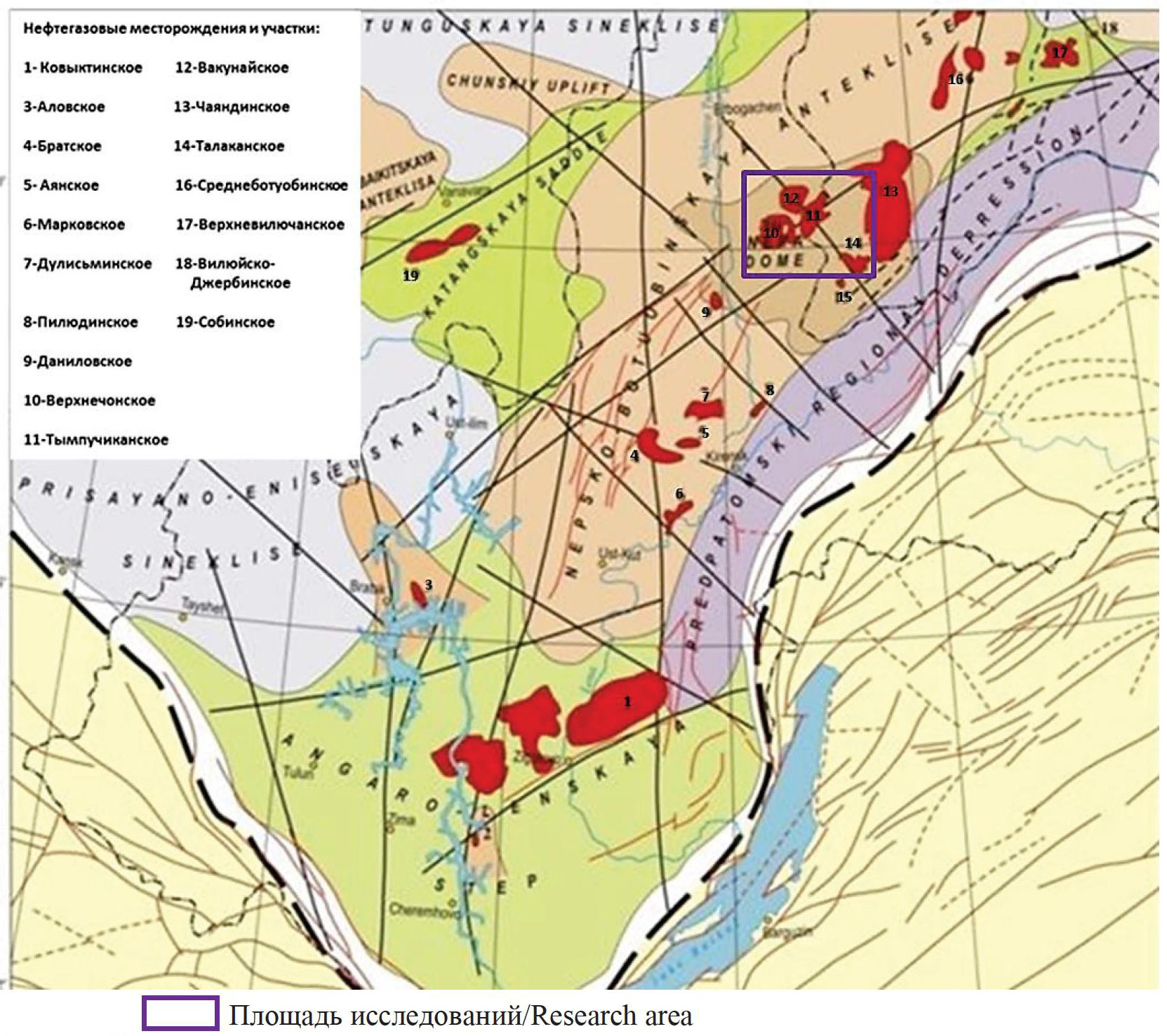 Рис. 4. Структурно-тектоническая схема района расположения основных месторождений нефти и газа Восточной Сибири [20, 21]