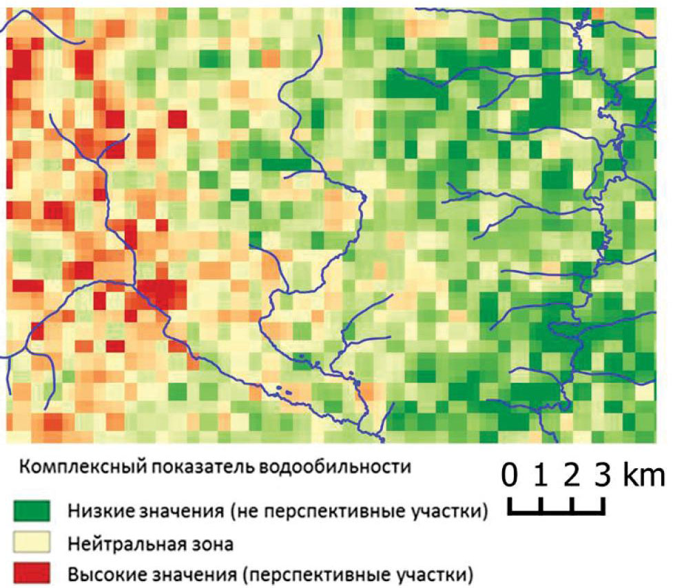 В результате в соответствии с рассчитанным комплексным показателем водообильности выделены наиболее перспективные для бурения разведочных скважин участки (рис. 5), что позволило сократить первоначально намеченный объем бурения почти на 30 % [12, 13, 17].