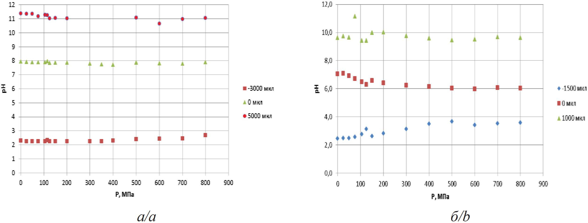 Влияние давления на изменения рН суспензии при объеме титранта V=3000 мкл HCl приведено на рис. 3.
