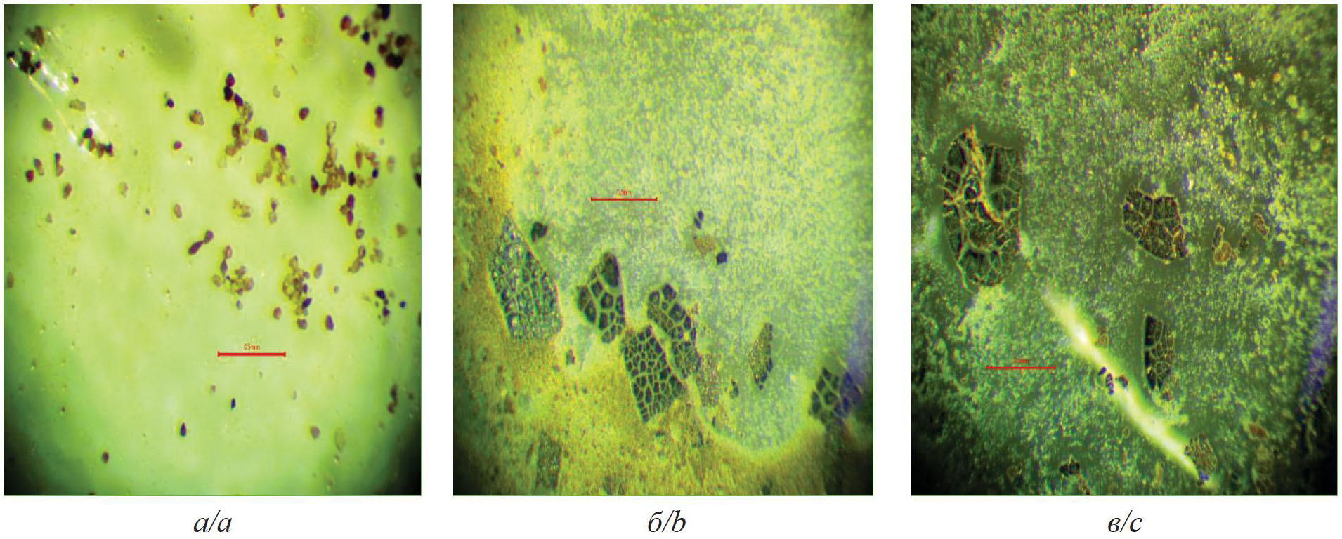Fig. 4. Images of dissolved asphalt-resin-paraffin deposits obtained during the series of studies No. 2 for a fraction: a) <0.05; b) 0.25–0.05; c) 0.5–0.25 mm