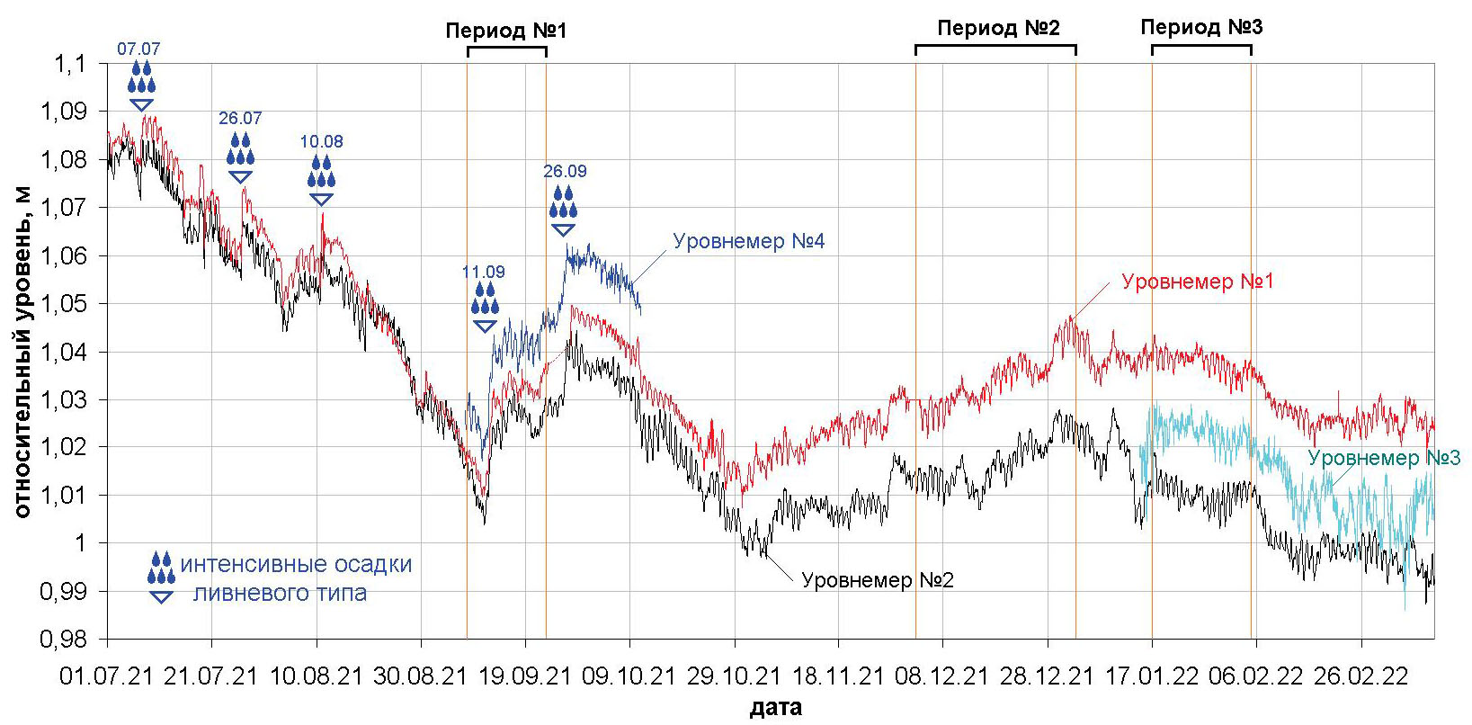 Испытания проводились с 01.07.2021 по 11.03.2022. В этот период испытуемые уровнемеры устанавливались в скважине Т-21 на различное по продолжительности время. В статье представлены результаты по трем периодам измерений, выполненным в разное время года (периоды №№ 1–3 на рис. 2).