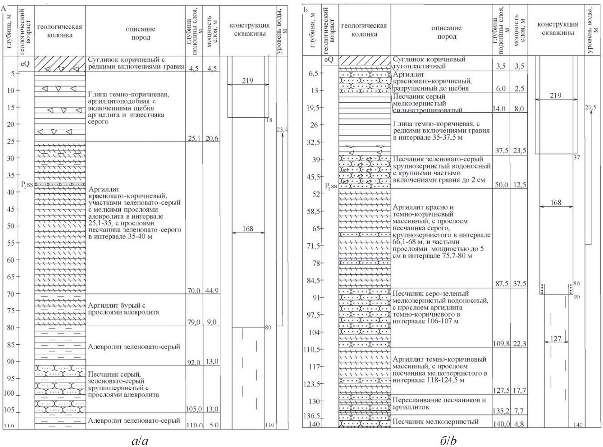 В нижнем течении р. Безымянный ручей на расстоянии 0,45 км от родника № 1 были пробурены скважины № 16002/1 глубиной 140 м и № 16002/2 глубиной 55 м. Столь близкое расположение скважин обусловлено необходимостью оценить степень гидравлической связи различных гидродинамических интервалов – 35–55 и 90–140 м.
