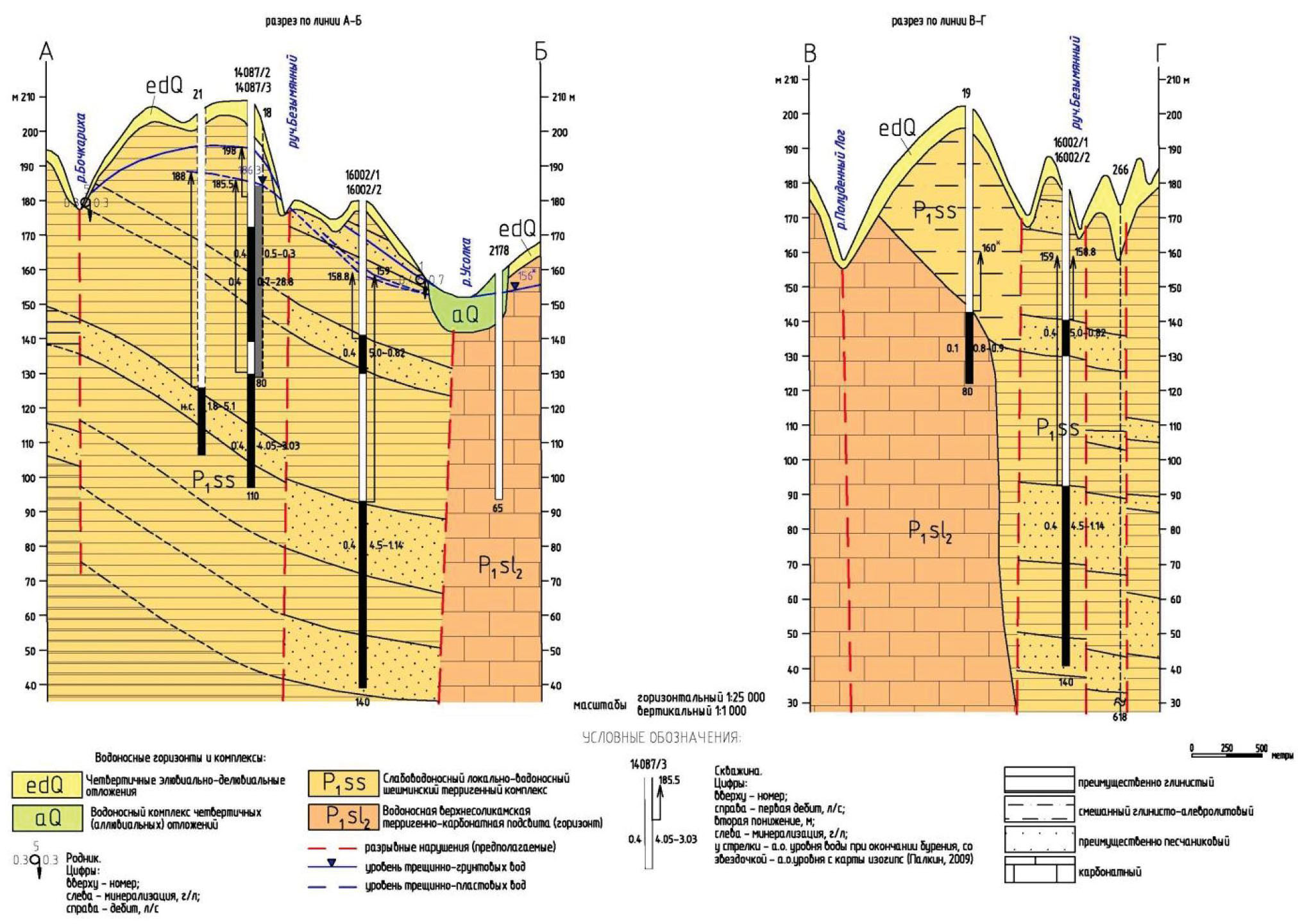 Анализируя данные бурения поисковых и оценочных скважин, фондовых и архивных материалов, результат опытно-фильтрационных работ, можно сделать вывод, что в пределах района исследования имеется два продуктивных водоносных пласта, приуроченных к одному водоносному комплексу и гидравлически изолированных друг от друга 40 м толщей водоупорных пород. В плане водоносный комплекс имеет граничные условия II рода. В результате полученных данных была построена схематическая гидрогеологическая карта и гидрогеологические разрезы исследуемой территории (рис. 11, 12).