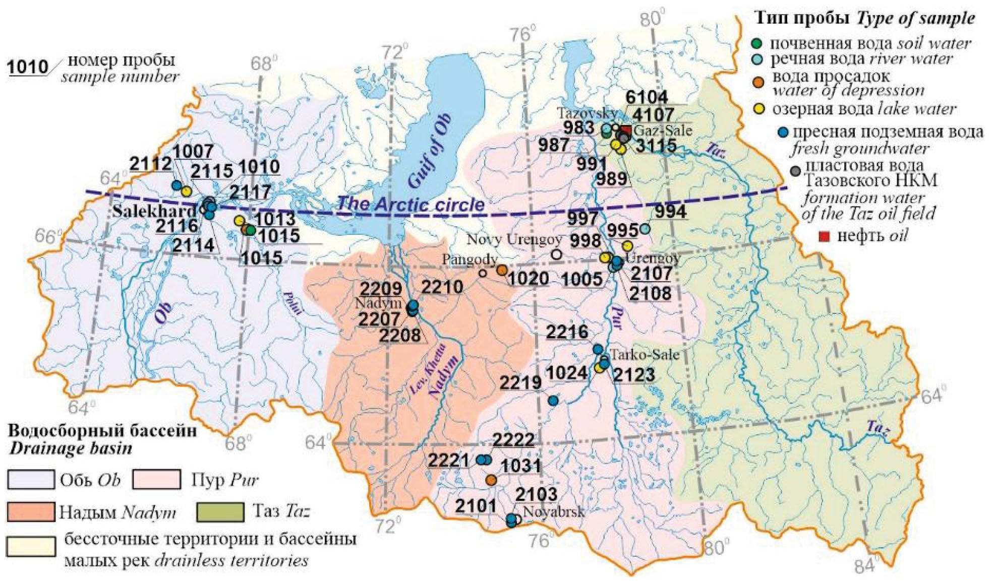 Objects. Surface (river, soil and lake), underground waters of the active water exchange zone of the Yamalo-Nenets autonomous region and formation waters of oil and gas deposits of the Taz field.