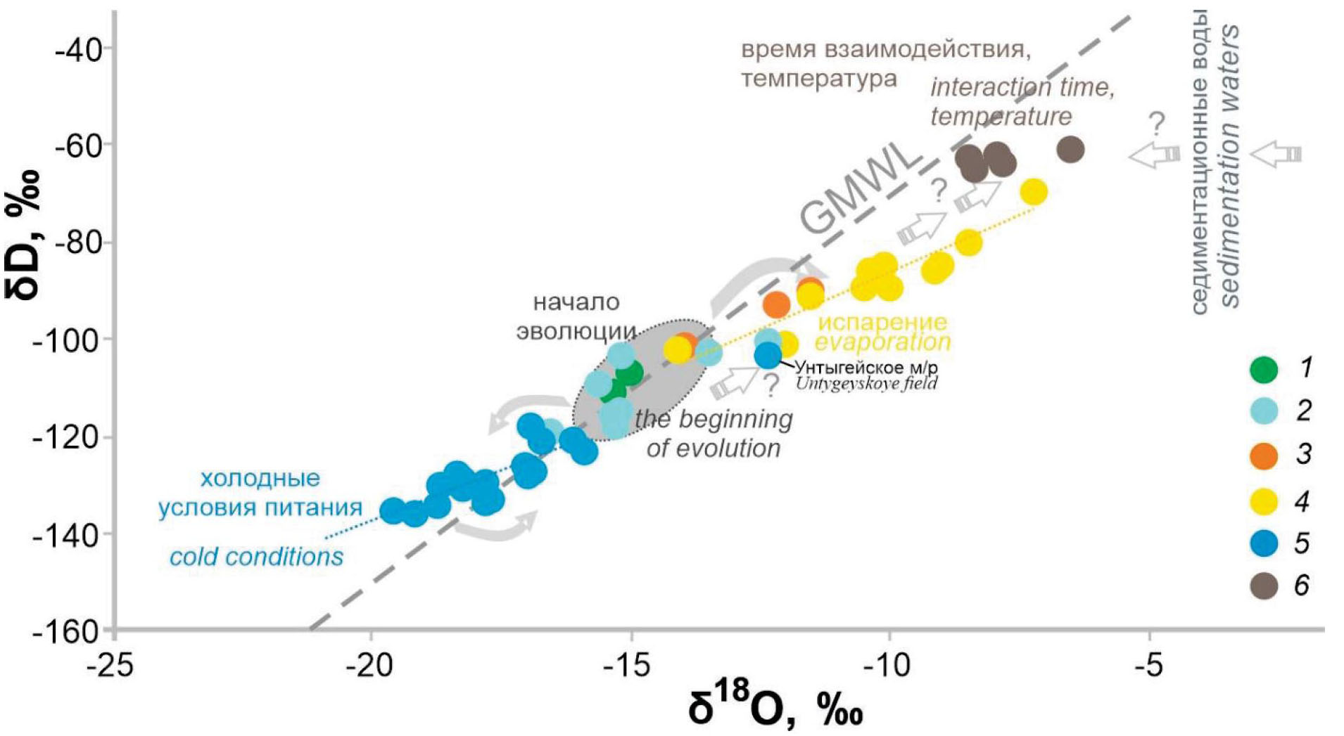 Намного глубже, в отложениях нижнего этажа, совершенно другая картина. В водах апт-альб-сеноманского водоносного горизонта (~1200 м) наблюдается значительное утяжеление изотопного состава: значения δD составляют от –64,2 до –60,3 ‰ при δ18О от –8,5 до –6,5 ‰. Проследить полную эволюцию изотопного состава вод в интервале глубин от 200 до 1200 м не представляется возможным, поскольку на текущий момент мы не располагаем полным объемом данных. По-видимому, промежуточное положение между водами верхнего и нижнего этажей занимает проба из атлым-новомихайловского горизонта Унтыгейского месторождения со значениями δD –103,1 ‰ и δ18О –12,3 ‰ (рис. 2), выбивающаяся из этих двух групп точек. Можно сделать вывод о том, что, по мере просачивания вод из зоны активного водообмена в зону замедленного и весьма замедленного водообменов, изотопный состав воды значительно утяжеляется, особенно по кислороду (КС от 0,5 до 2,3 ‰). Данный эффект довольно ожидаем для вод глубоких водоносных горизонтов и объясняется наличием более высоких температур на глубине и достаточно длительным взаимодействием подземных вод с вмещающими алюмосиликатными горными породами, для которых характерны значения δ18O на 20–30 ‰ тяжелее, чем в водах [32]. При относительно длительном времени взаимодействия происходит изотопный обмен «легкого» кислорода вод с «тяжелым» кислородом пород [33].