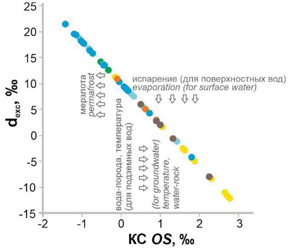 Для сравнения с глобальной линией метеорных вод (ГЛМВ, – Global Meteoric Water Line – GMWL) [27] были нанесены фигуративные точки по изотопному составу вод разных водных объектов на диаграмму δD–δ18О (рис. 2). Также была показана зависимость КС от dexc (рис. 3), которая, конечно, легла в прямую линию и имеет обратную линейную корреляцию, но она оказалась показательной для выделения реперных показателей по каждому водному объекту.
