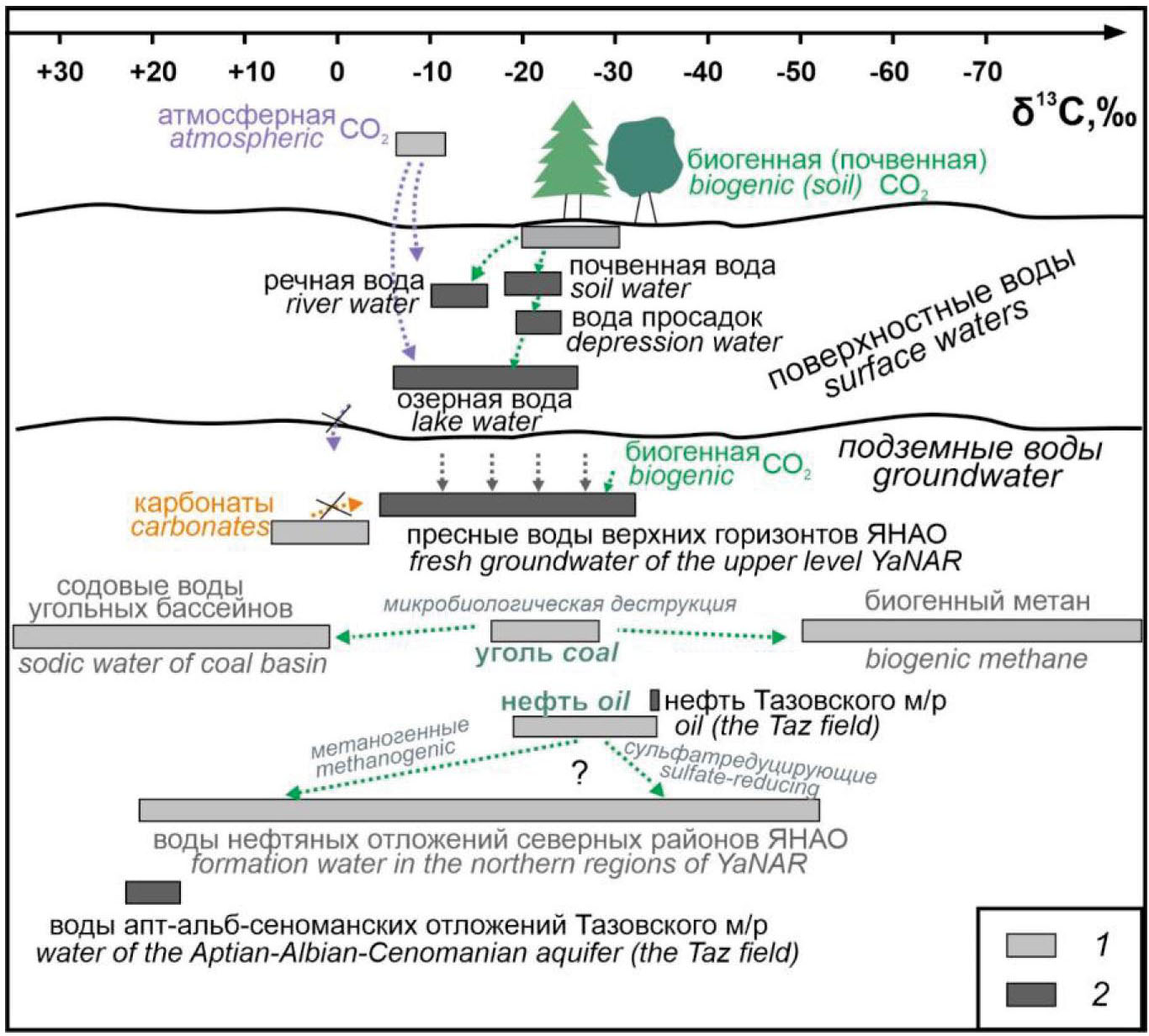 - По изотопному составу водорастворенного углерода (δ13СDIC), совместно с привлечением и других данных по геологии и гидрогеологии региона, в водах ЯНАО присутствуют два источника углекислоты: биогенный и атмосферный. В водах почв и просадок принимает участие только биогенный СО2, а в речных и озерных водах, с увеличением размера озер и интенсивности потока движения, начинает принимать активное участие атмосферная утяжеленная углекислота. В подземной гидросфере атмосферная углекислота перестает принимать участие в формировании состава вод. Согласно геологическим условиям не участвует углерод, образующийся при разложении карбонатных пород (по крайней мере, в больших масштабах), и любой глубинный (магматический, метаморфический). Остается только биогенная углекислота, изменения изотопного состава которой связаны с различными процессами. Пресные подземные воды верхнего этажа наследуют изотопный состав гидрокарбонат-иона поверхностных вод смешанного генезиса. Сохранение достаточно высоких значений δ13СDIC при отсутствии атмосферной углекислоты, возможно, связано с криогенной метаморфизацией вод. Более тяжелый состав водорастворенного углерода апт-альб-сеноманских отложений может свидетельствовать о разложении анионов органических кислот метаногенными бактериями.
