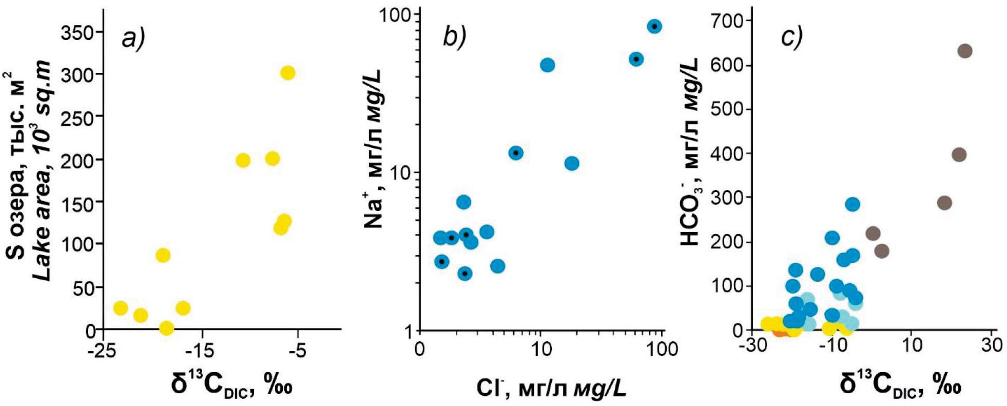 Рис. 5. Графики зависимости: а) значений δ13C озерных вод от площади озера; b) концентрации ионов натрия от хлора (с точкой внутри – значения δ13C >–11 ‰); c) значений δ13C природных вод региона от концентрации гидрокарбонат иона. Условные обозначения представлены на рис. 2