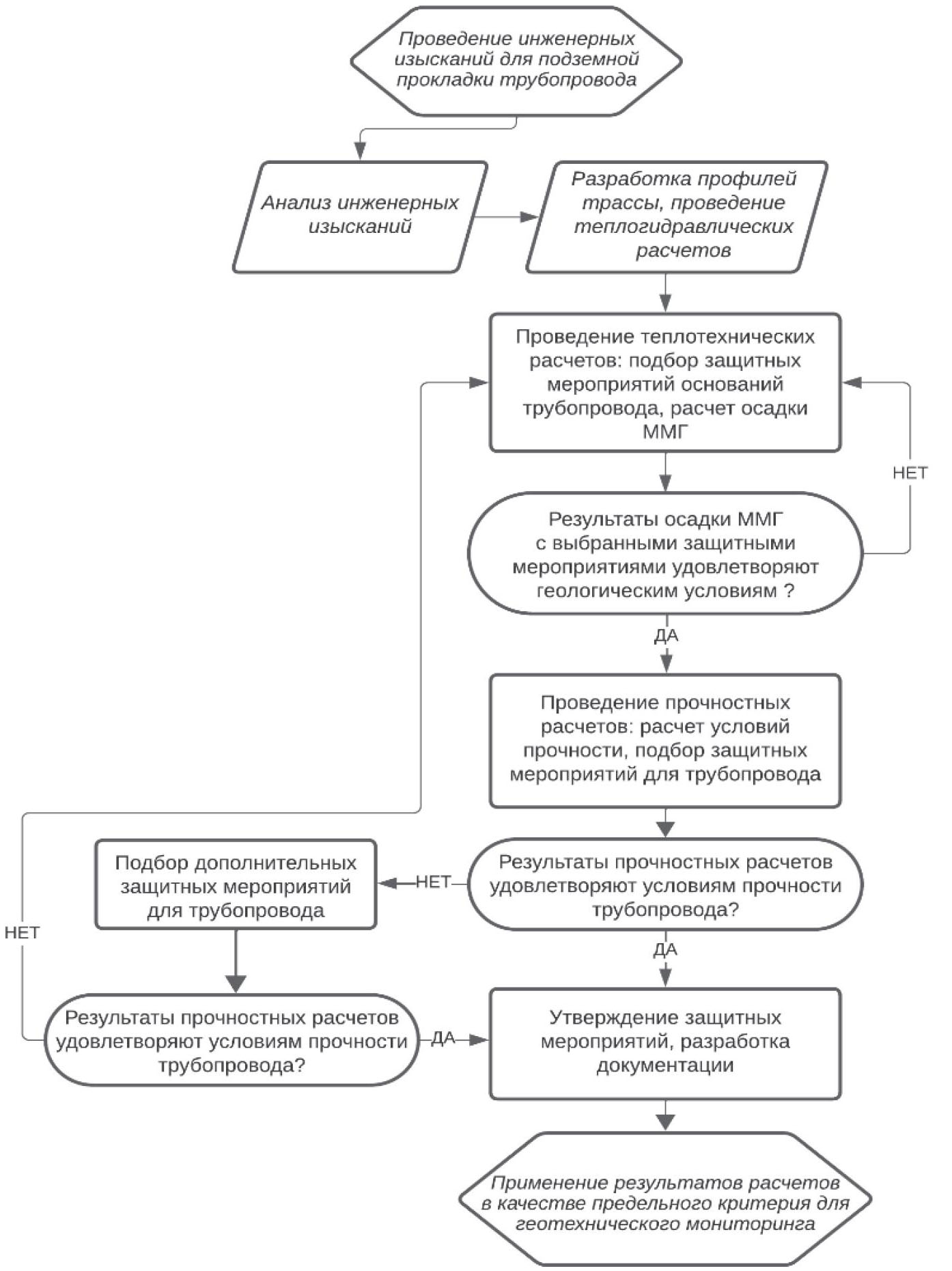 Комплексная методика, основанная на итерационном тепломеханическом расчете всей протяженности трассы подземного трубопровода, применяется сотрудниками АО «ТомскНИПИнефть» в своих проектах с 2020 г. Методика заключается в объединении теплотехнического и прочностного расчетов, проведении анализа их результатов и итерационного подбора экономически эффективных защитных мероприятий, как основания трубопровода, так и самого трубопровода, по определенному алгоритму.