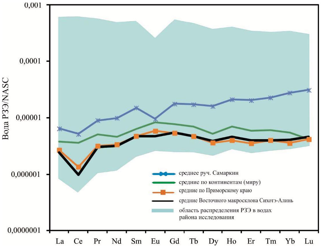 При проведении геохимических исследований широко распространено нормирование содержаний РЗЭ к их содержанию в эталонных образцах с целью определения процессов фракционирования элементов в различных физико-химических условиях [6]. В большинстве работ, в том числе и в данной, содержание РЗЭ нормировано на североамериканский сланец (NASC) [7].