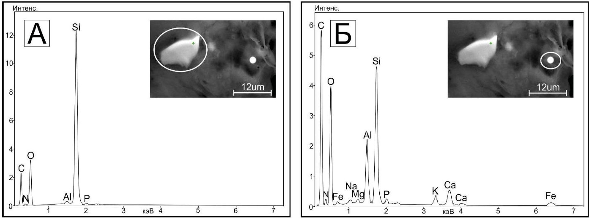 Рис. 5. Силикатные и алюмосиликатные минеральные фазы в костном (а) и головном (б) мозге изюбря