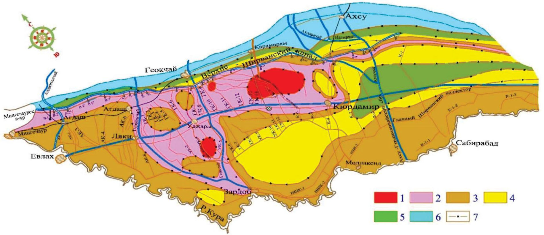 Fig. 2. Schematic map of Shirvan steppe zoning by types of groundwater regime for 1980–2020 (compiled by Ch.D. Gulmamedov). Regime types: 1 – irrigation-climatic; 2 – hydrological; 3 – irrigation; 4 – irrigation-irrigation-drainage; 5 – irrigation-irrigation; 6 – line type modes; 7 – hidroisohypses