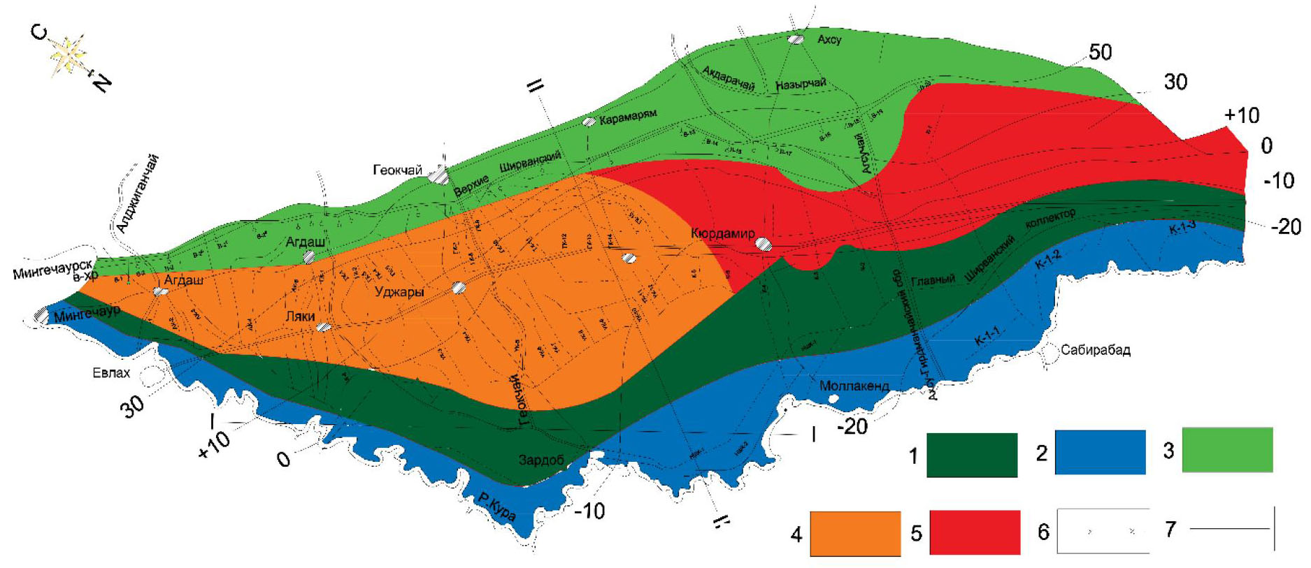Гидрогеологические условия Ширванской степи формировались под влиянием различных естественных и техногенных факторов, таких как рельеф местности, климат, гидрографические сети, геолого-тектоническое строение, ирригационно-орошаемые системы, атмосферные осадки и др. Отличие Ширванской степи от других предгорных равнин – в образовании осадков второго конуса выноса внутри степных рек. Реки, взявшие свое начало с южных склонов Большого Кавказа – Алиджанчай, Турианчай и Геокчай – свои первичные выносы (крупнообломочные) образуют в Ганых-Агричайской долине, а потом, пересекая Аджиногурские глинистые породы неогенового возраста, формируются в Ширванской степи. В связи с этим в литологическом составе конусов выноса этих рек на территории Ширванской степи преимущественно наблюдаются мелкозернистые пески, суглинки и глины. И это действует на количественный и качественный состав подземных водных ресурсов, то есть на гидрогеологические условия. Здесь особую роль играет геологическое строение территории [14–21]. В связи с этим на территории конусов выноса рек сформировались грунтовые и подземные напорные воды, а в межконусных депрессиях и в восточных частях степи – только грунтовые воды.
