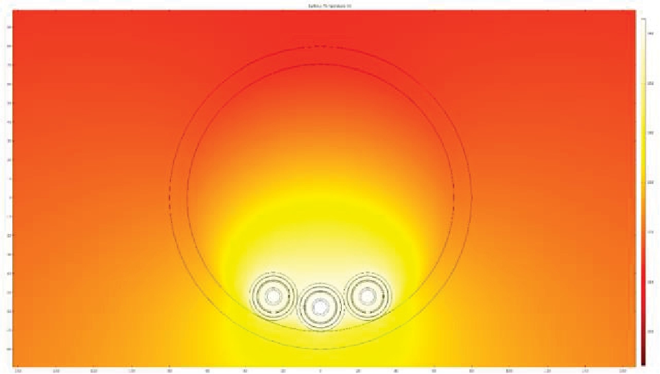 В рамках эксперимента 1 было проведено два этапа: до корректировки величины протекающего тока и после корректировки. Поправочный коэффициент на величину длительно-допустимого тока для кабелей с алюминиевыми ТПЖ, k4, будет находиться в диапазоне от 0,84 до 0,96. Причём большие значения коэффициента имеют место для меньших сечений кабеля. Полученные в рамках эксперимента результаты представлены в табл. 2. На рис. 1 представлена картина температурного поля системы однофазных кабелей с изоляцией из сшитого полиэтилена сечением 50 мм2 на напряжение 10 кВ, расположенных треугольником, после корректировки.