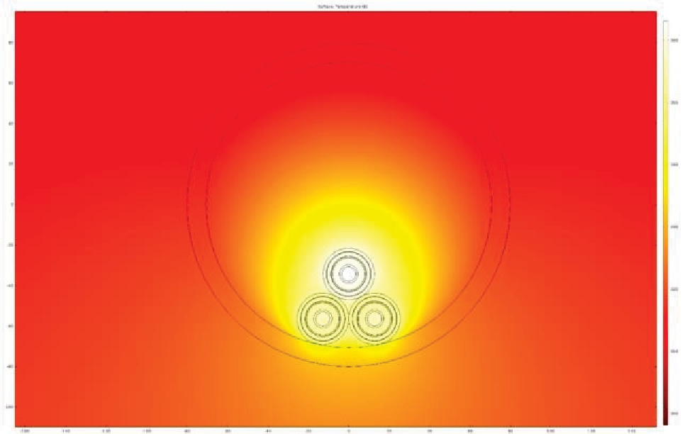 Для кабелей, проложенных треугольником, имеет место другая картина распределения температурного поля. Так как кабели касаются друг друга в двух точках, процессы теплопередачи будут проходить интенсивнее. В соответствии с ПУЭ данный способ прокладки возможен, а значит необходимо рассмотреть и его.