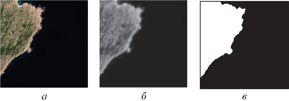 Поскольку итоговое ранжирование содержит две наилучшие альтернативы a6∼a7∼a8∼a9, т. е. v=4, по формуле (6) получено значение x*=(a7+a8)/2=(52,0+59,5)/2=55,75. Найденный результат комплексирования принимается за порог яркости f=x*56. По формуле (1) формируется бинаризованное изображение D, представляющее собой результат сегментации (рис. 4, в), где черная область соответствует морю, а белая суше.