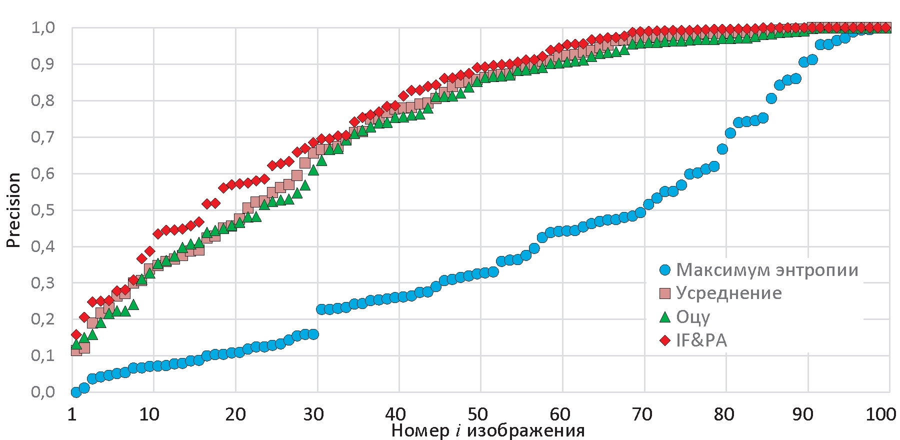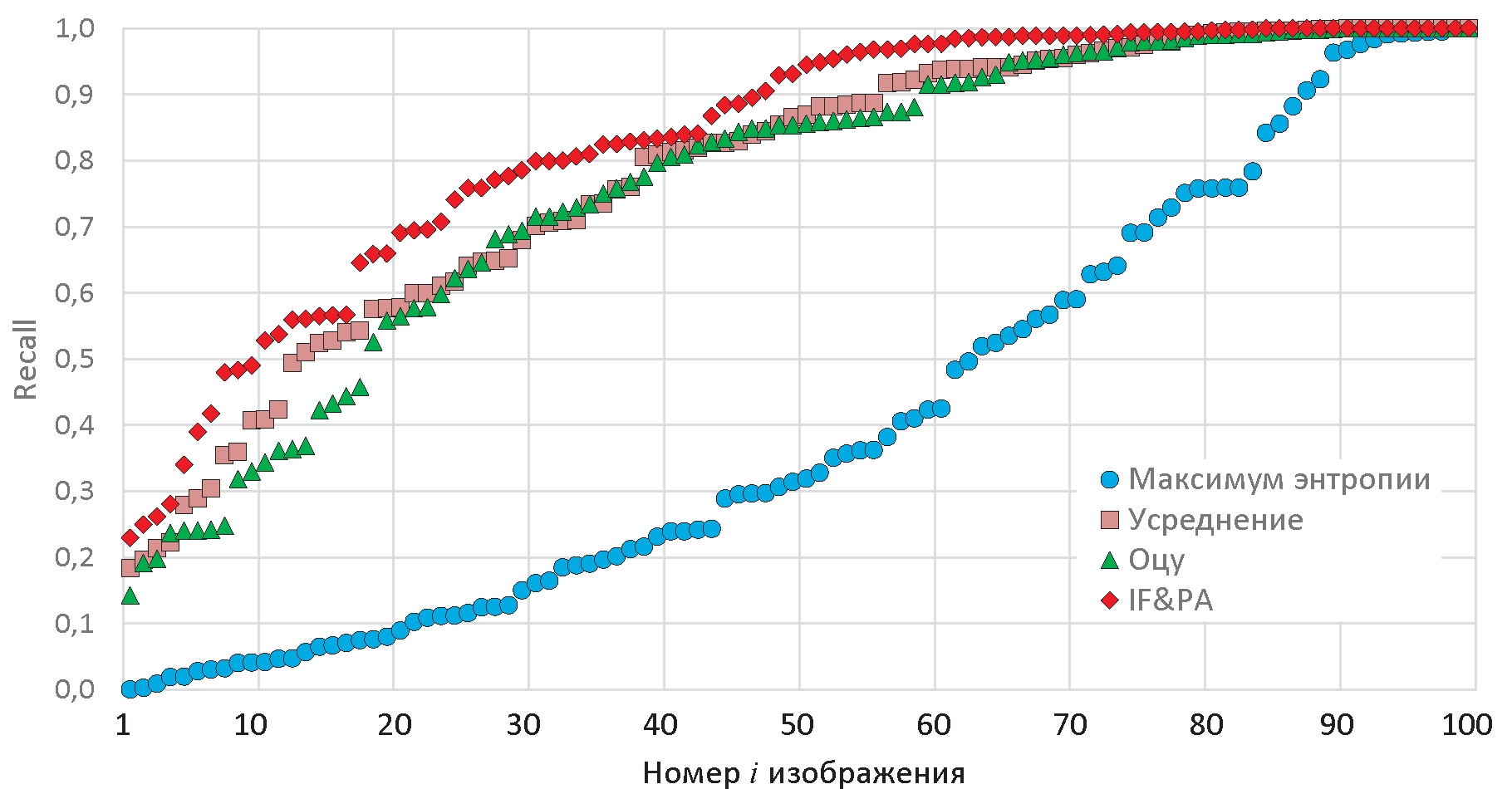 По тому же принципу, что и графики распределения отклонений ξi на рис. 8, были построены кривые распределения значений показателей Precision и Recall по всем проанализированным изображениям (рис. 9, 10). В отличие от рис. 8, на рис. 9, 10 наилучшему методу соответствует кривая, расположенная ближе остальных кривых к горизонтальной линии, проходящей через значение 1,0. Из графиков на рис. 9, 10 видно, что этому требованию удовлетворяет кривая красного цвета, соответствующая методу IF&PA. Результаты экспериментальных исследований показывают, что на большинстве протестированных изображений предложенный метод имеет более высокое качество сегментации, чем три традиционных метода, использованных для сравнения.
