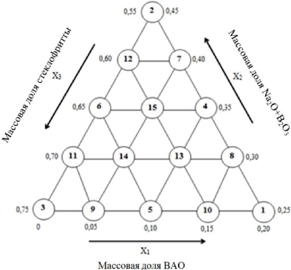 Для достижения поставленной цели решено применить симплекс-решетчатый план для получения в дальнейшем полинома, отражающего зависимость исследуемого свойства смеси от содержания в ней компонентов [15]. Этот метод позволяет при относительно малом числе опытов получить математическую модель в виде так называемого приведенного полинома, отражающего зависимость исследуемого свойства от содержания компонентов, входящих в стекло, для исследуемой области составов. Упрощение решения подобной задачи осуществляют путем выделения групп компонентов, внутри которых соотношение составных частей не меняется.