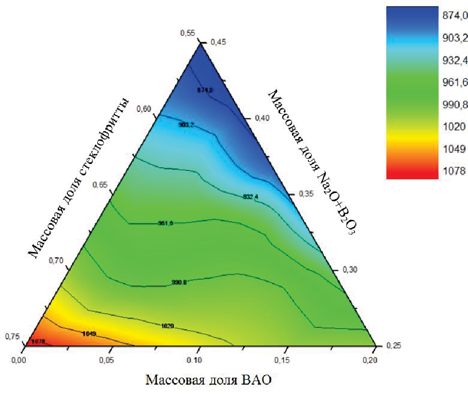 Из рис. 6 видно, что область стекол, у которых вязкость от 50 до 100 дПа∙с (темно-синяя область) при температуре 900 °С, расположена там, где содержание оксидов натрия и бора от 35 до 45 %, стеклофритты – 55 %, ВАО – от 0 до 10 %. Из рис. 7 видно, что область с вязкостью от 35 до 100 дПа∙с (от синей до зеленой области) при температуре 1000 °С расположена там, где содержание оксидов натрия и бора от 30 до 45 %, стеклофритты от 55 до 60 %, ВАО от 0 до 15 %.
