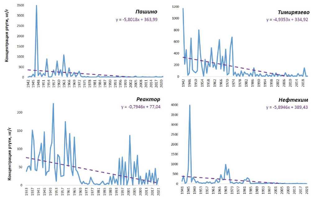 Динамика накопления ртути в древесине всех исследованных деревьев свидетельствует о снижении поступления поллютанта от 1933 к 2021 гг., что подтверждают графики линейных трендов (рис. 1).