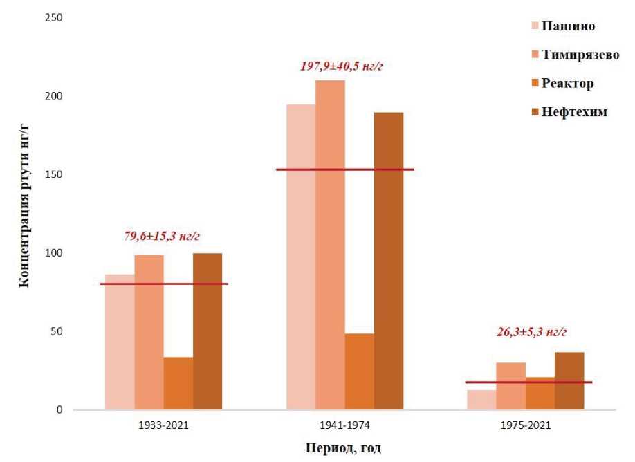 Интересно отметить синхронность хронологии поступления Hg во всех точках опробования (рис. 1), также за исключением точки «Реактор». Кратность превышения среднего значения в период с 1941 по 1974 гг. в точках «Пашино», «Тимирязево» и «Нефтехим» составляет 15,5; 7 и 5,1, соответственно. Для иллюстрации полученных периодов повышенных концентраций ртути в кернах сосны были построены столбчатые диаграммы, демонстрирующие два периода со значимо отличающимися средними содержаниями Hg в кернах всех исследованных деревьев (рис. 2). Резкий рост содержания ртути в древесине с 1941 г. объясняется эвакуацией около 30 промышленных предприятий в период Великой отечественной войны (1941–1945 гг.) из европейской части России в г. Томск. Среди них – ярославский «Электромашиностроительный завод»; московские заводы: «Манометр», «Первый подшипниковый завод», «Электропровод», «Москабель», «Электроламповый завод», «Красный богатырь»; ленинградские заводы: «Радист» и «Электросила» и др. [32].