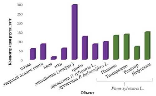 Сравнивая валовое содержание ртути в древесине сосны Томского района с концентрациями в сопредельных средах (рис. 3), следует отметить превышение по всем представленным на рисунке средам в: почвы 1,2–2,7; твердый осадок снега 1,6–1,8; хвоя 6,1–13,3; мхи 1,2–2,5; грибы 1,1–1,2; древесина сосны 1,6–1,8; древесина тополя 1,4–1,6 раз, за исключением эпифитных видов лишайников [6].