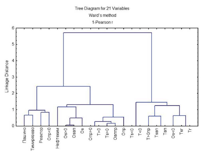 Fig. 4. Dendrogram of the correlation matrix of the affect of climatic parameters on mercury flow into the annual rings of Pinus sylvestris L. in the Tomsk region, indicators: Temperature: Tг – average annual; Tsг – amount for the year; Твп – during the growing (vegetative) season; Tsвп – amount for the growing season; T>0; Т>0s – sum of positive temperatures; T>0пр – duration of the period with positive temperatures; T<0; T<0s – sum of negative temperatures; Precipitation: Оsг – amount for the year; Опр – number of days with precipitation during the year; Оsвп – amount for the growing season; O>0s – sum at positive temperatures; О<0s – sum at negative temperatures; O>0пр – number of days with precipitation at positive temperatures; O<0пр – number of days with precipitation at subzero temperatures