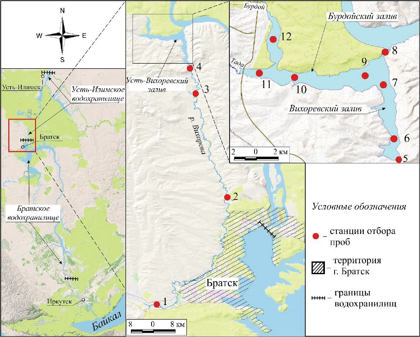 Objects. Waters of the Vikhoreva river before and after inflow of wastewater from the Bratsk industrial zone, waters of the Ust-Vikhorevsky bay (Vikhorevskaya and Burdoyskaya parts) of the Ust-Ilimsk reservoir.