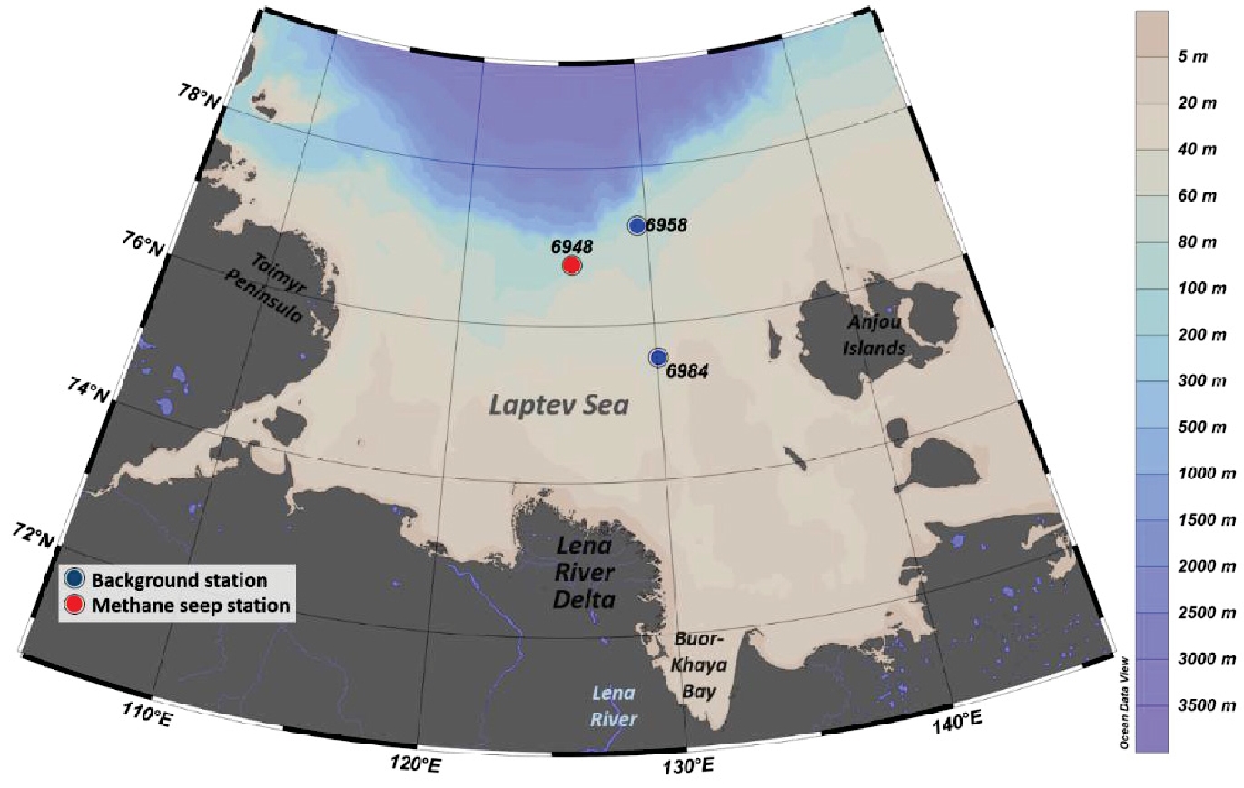 Подводная мерзлота шельфа МВА в последние 30 лет деградирует с удвоенной скоростью по сравнению со скоростями предшествующих десятилетий [3]. Так, в море Лаптевых задокументировано более 700 мест разгрузки геофлюида (в т. ч. инфильтрации метана различной интенсивности) [4, 5], что придает данному району статус глобального эмитента метана – второго по значимости парникового газа [6–12].