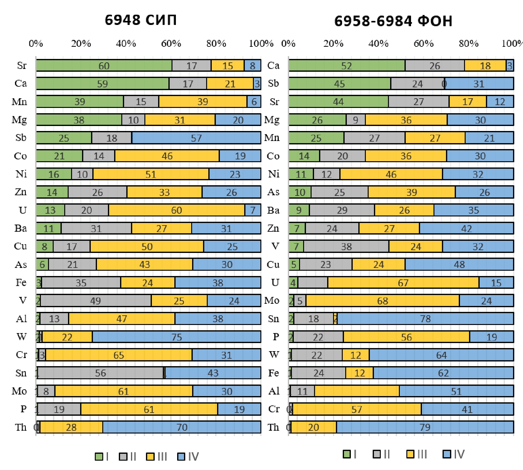 Визуально видна тенденция к снижению доли IV фракции на сиповой станции, что говорит о переходе элементов из инертной в подвижную форму. Наиболее значимые снижения доли IV фракции зафиксированы для Cu (–23 отн. %), Fe (–24 отн. %) и Sn (–36 отн. %), чуть меньшие – на уровне –10–20 отн. % – характерны для Cr, Co, Al, Mn, Zn. Также присутствуют элементы, для которых наблюдается обратная тенденция к росту доли остаточной фракции – сурьма (+27 отн. %) и вольфрам (+11 отн. %). В целом на совокупность III и IV форм приходится от 40–90 % от общего количества элемента.