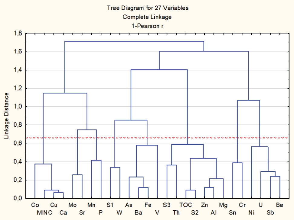 Как видно из дендрограммы корреляционной матрицы геохимического спектра по средневзвешенным содержаниям и некоторым пиролитическим параметрам, геохимические спектры образуют восемь значимых микроассоциаций {Co-MinC-Cu-Ca; Mo-Sr; Mn-P; W-S1; As, Ba, Fe, V; S3-Th-TOC-S2-Zn-Al-Mg; Sn-Cr; Ni-U-Sb-Be} (рис. 3).