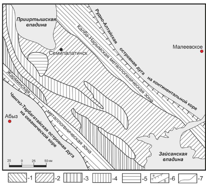 Рис. 1. Схематическое металлогеническое районирование Восточной и Центральной части Казахстана [2] с дополнениями. Условные обозначения: 1 – энсиалические блоки зоны коллизии, 2 – энсиматические блоки зоны коллизии, 3 – терейны карбоновой островной дуги, 4 – сутура коллизионной зоны, 5 – область триасового континентального магматизма, 6 – границы коллизионной зоны (а) и блоков на различном основании (б), 7 – прочие геологические границы