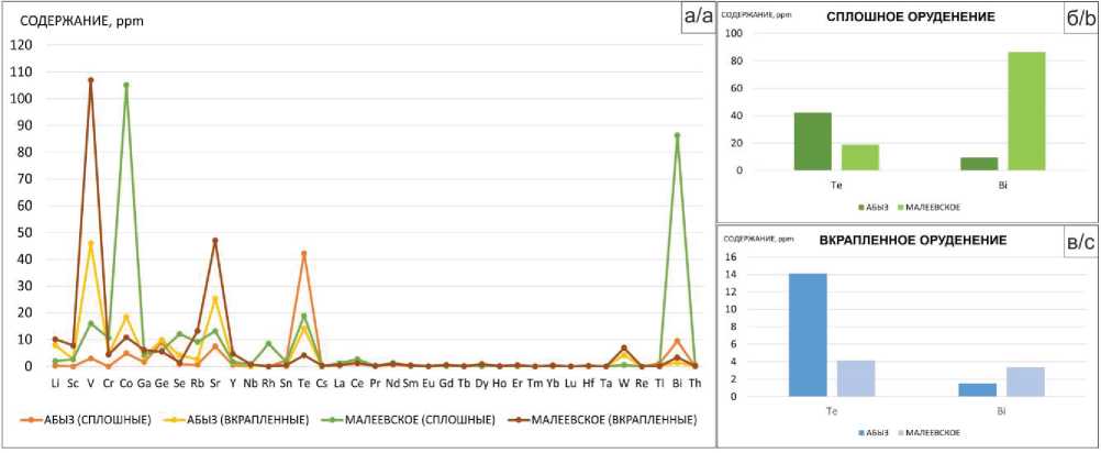 Fig. 2. a) graph of the content of trace elements in the ores of the Abyz and Maleevskoe deposits; b, c) comparative diagrams of tellurium and bismuth content in solid (b) and disseminated (c) ores of the deposits