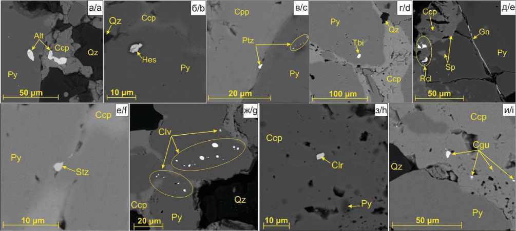 Рис. 3. Снимки со сканирующего электронного микроскопа, демонстрирующие включения алтаита (а), гессита (б), петцита (в), теллуровисмутита (г), раклиджита (д), штютцита (е), калаверита (ж), колорадоита (ж), ченгуодаита (и). Условные обозначения: Py – пирит, Qz – кварц, Ccp – халькопирит, Sp – сфалерит, Gn – галенит, Alt – алтаит, Hes – гессит, Clv – калаверит, Tbi – теллуровисмутит, Rcl – раклиджит, Stz – штютцит, Cgu – ченгуодаит, Ptz – петцит, Clr – колорадоит