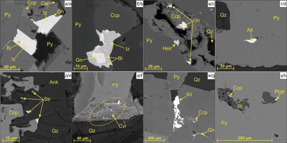 Рис. 4. Снимки со сканирующего электронного микроскопа в обратно рассеянных электронах, демонстрирующие включения в рудах изоклейкита (а), самородного висмута (б), гессита (в), алтаита (г), сстрокаита (д), цервеллеита (е), ксилингоита (ж), плюмботеллурита (з). Условные обозначения: Py – пирит, Qz – кварц, Ank – анкерит, Ccp – халькопирит, Sp – сфалерит, Gn – галенит, Alt – алтаит, Hes – гессит, Cvl – цервеллеит, Xil – ксилингоит, Pbtlr – плюмботеллурит, Iz – изоклейкит, Bi – самородный висмут, Str – сстрокаит, Fb – фрейбергит