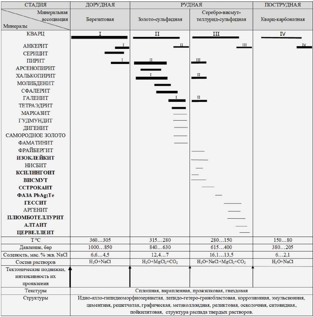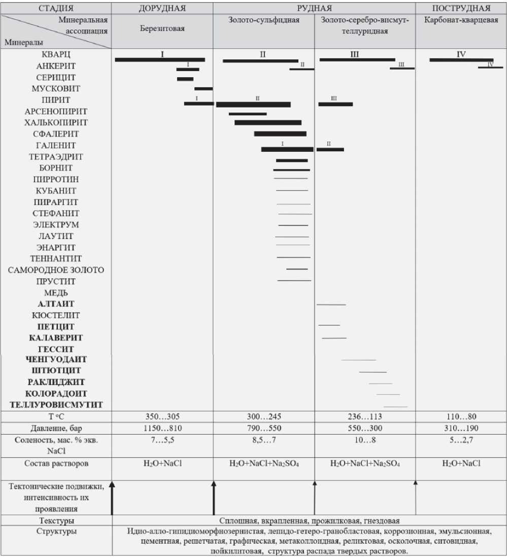 В пределах рудной стадии выделено две ассоциации: золото-сульфидная и золото-серебро-висмут-теллуридная.