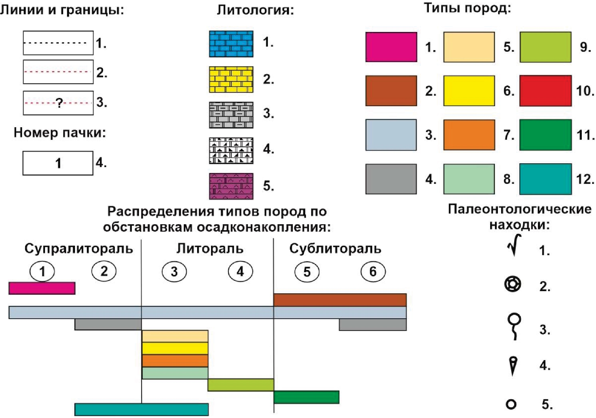 Формирование отложений происходило в условиях сублиторали, литорали и супралиторали. На (рис. 2–4) показана схема корреляции изученных скважин с распределением выделенных типов пород и обстановок осадконакопления (рис. 5).