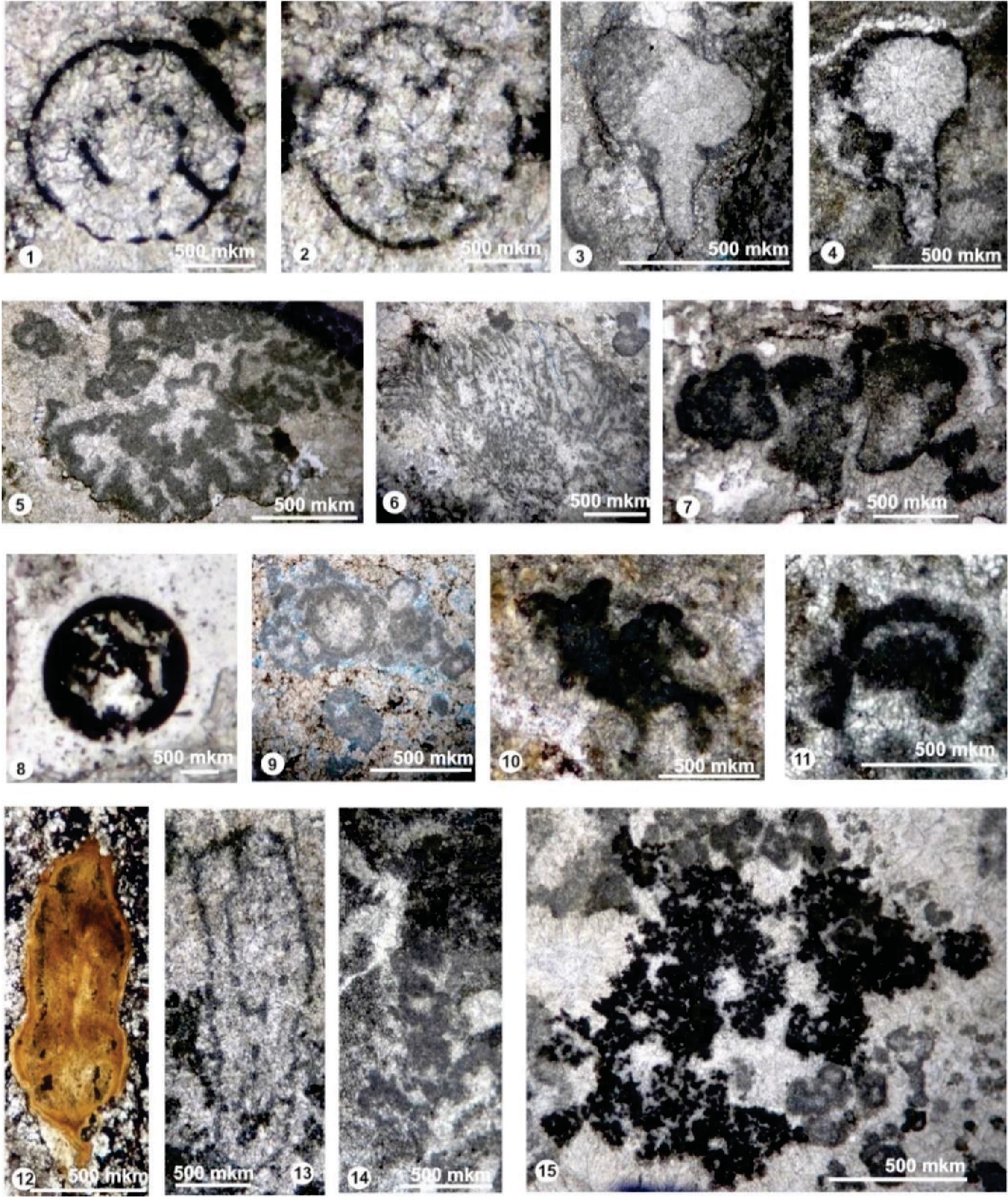 Рис. 6. Фототаблица палеонтологических находок из осинской подсвиты. Фиг. 1. Archaeocyatha. шл. № 132645 гл. 2955,52 м; Фиг. 2. Archaeocyatha. шл. № 132662 гл. 2969,57 м; Фиг. 3. Namacalathus sp. шл. № 132701 гл. 2997,68 м; Фиг. 4. Namacalathus sp. шл. № 132701 гл. 2997,68 м; Фиг. 5. Renalcis polymorphus. шл. № 132645 гл. 2955,52 м; Фиг. 6. Bija sp, Korilophyton sp. шл. № 132645 гл. 2955,52 м; Фиг. 7. Renalcis granosus. шл. № 129414 гл. 2113,80 м; Фиг. 8. Archaesphaera cambrica. шл. № 89 гл. 1787,63 м; Фиг. 9. Renalcis seriata, Renalcis granosus. шл. № 105698 гл. 23786,19 м; Фиг. 10. Renalcis levis. шл. № 105703 гл. 2379,33 м; Фиг. 11. Chabakovia sp. шл. № 129414 гл. 2113,80 м; Фиг. 12. Ramifir sp. шл. № 105703 гл. 2379,33 м; Фиг. 13. Archaeocyatha. шл. № 132664 гл. 2970,50 м; Фиг. 14. Renalcis seriata. шл. № 132685 гл. 2991,33 м; Фиг. 15. Korilophyton sp. шл. № 132662 гл.